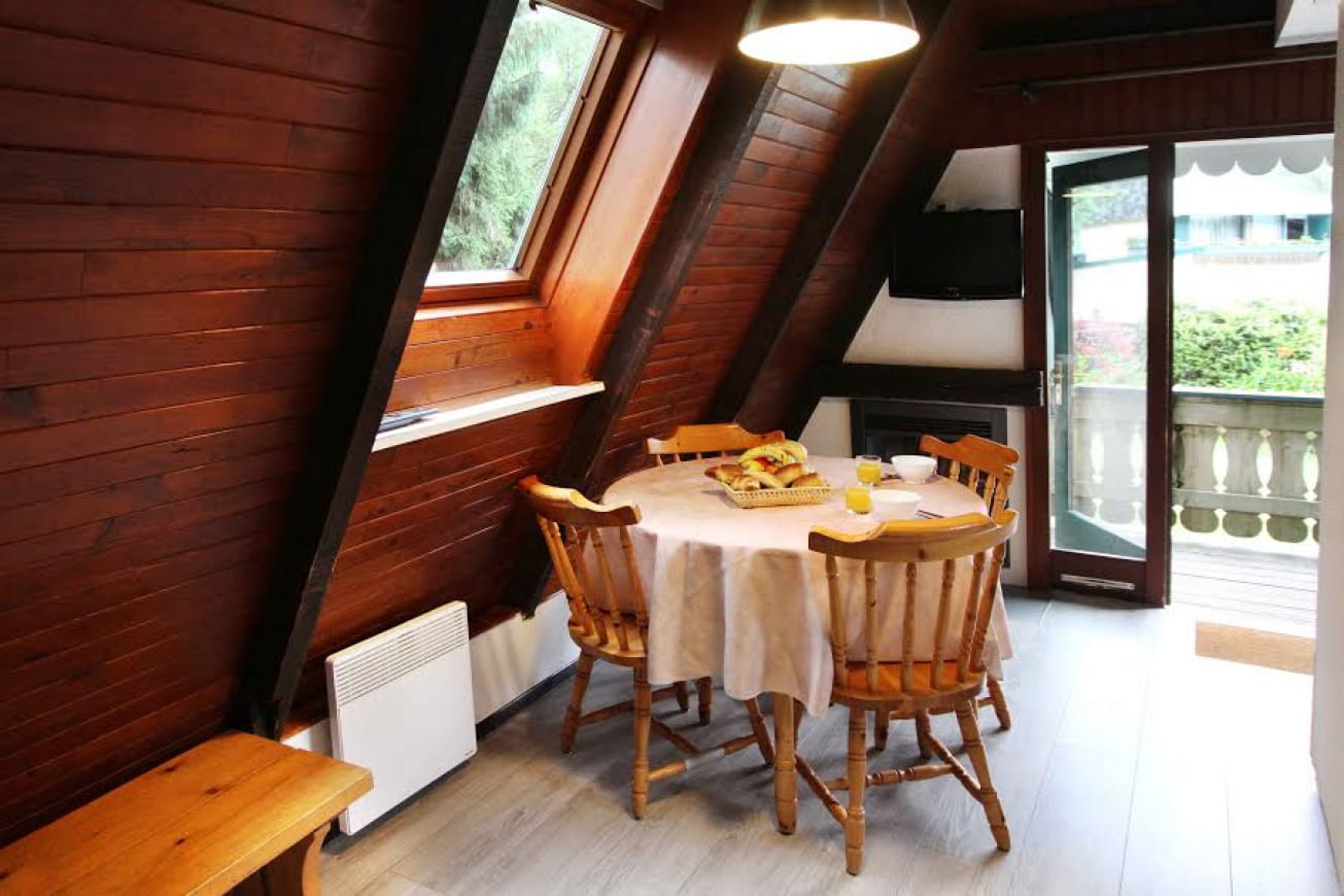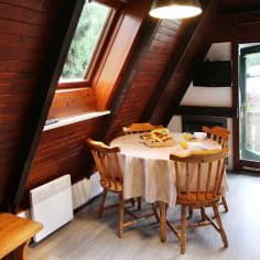 Si apre su un soggiorno arredato con una zona pranzo. Un camino elettrico riscalda l'ambiente durante le stagioni più fredde. Lo chalet ha anche 2 zone notte che possono ospitare una famiglia di 4 persone. Una camera da letto ha un letto matrimoniale standard e gli altri 2 dormono nella zona giorno.