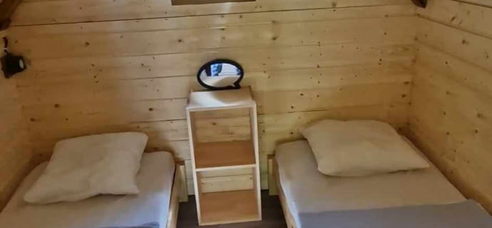 Perfettamente isolata, questa tenda 4 stagioni dispone di una camera da letto di 5 m² con 2 letti singoli, piumoni e cuscini, oltre a una piccola stufa su richiesta. La terrazza coperta di 4 m² è dotata di tavolo e sedie, per godersi un pasto o una pausa rilassante all’aria aperta. È disponibile anche una stanza sicura per riporre le biciclette o gli effetti personali.