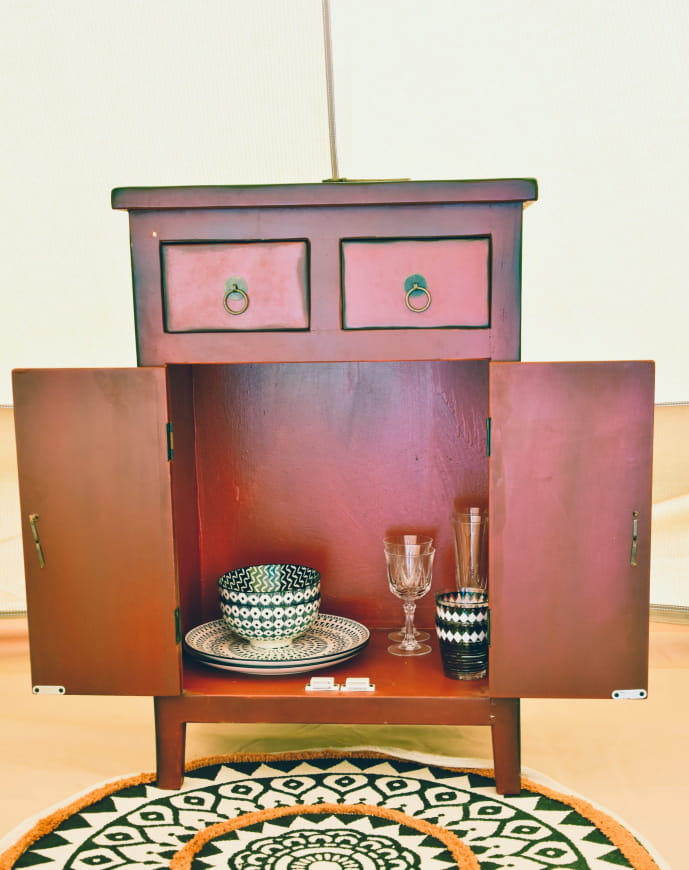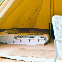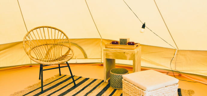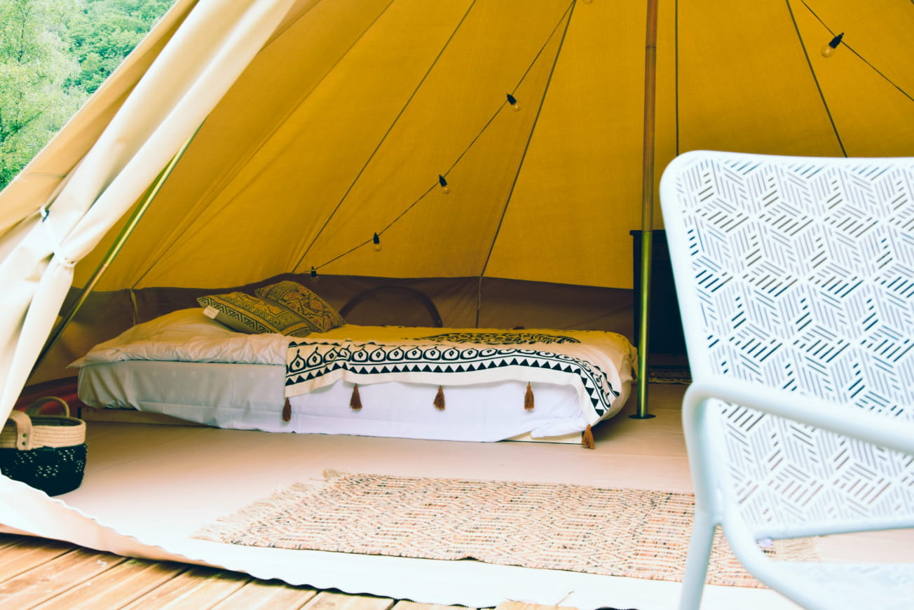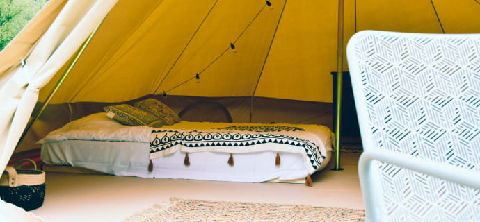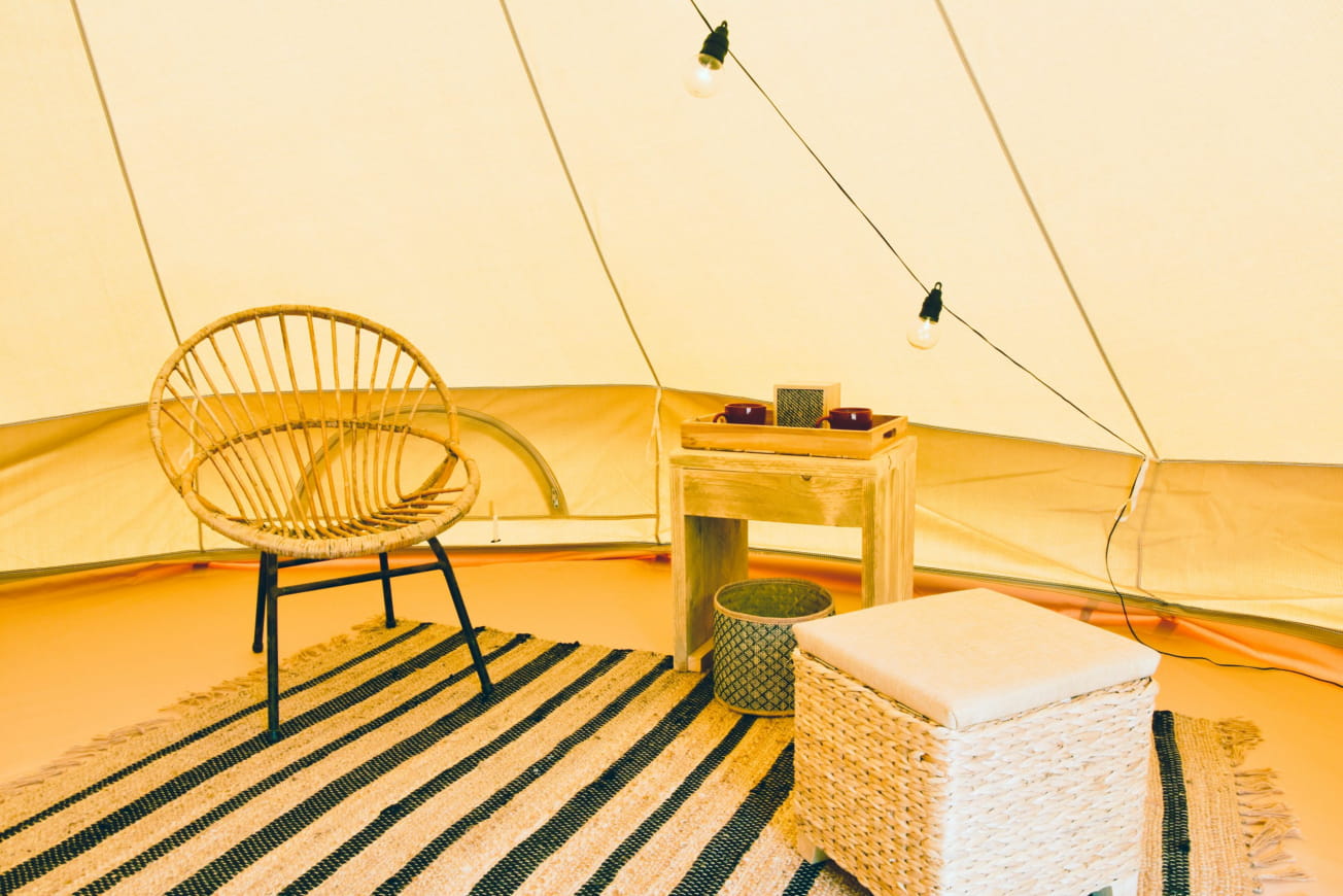 - Una tenda confortevole, con tutto l'equipaggiamento necessario: letto matrimoniale, lenzuola, frigorifero, stoviglie, posate...