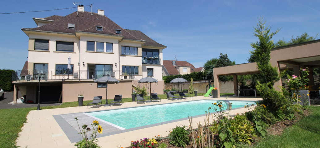 Questa residenza elegante e moderna può essere ammirata proprio nel mezzo dei vigneti dell'Alsazia. Si erge maestosa e la sua grande terrazza ombreggiata aggiunge eleganza alla proprietà. Le sue grandi finestre si aprono direttamente sul giardino e offrono una splendida vista sulle case caratteristiche della zona circostante. Potrete gustare la colazione nella sala da pranzo e prendere il sole sui lettini a bordo piscina. Se avete un desiderio particolare, su richiesta è disponibile una cucina completamente attrezzata.