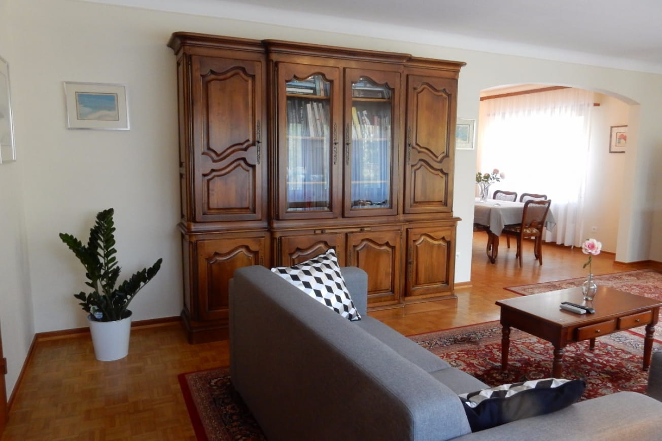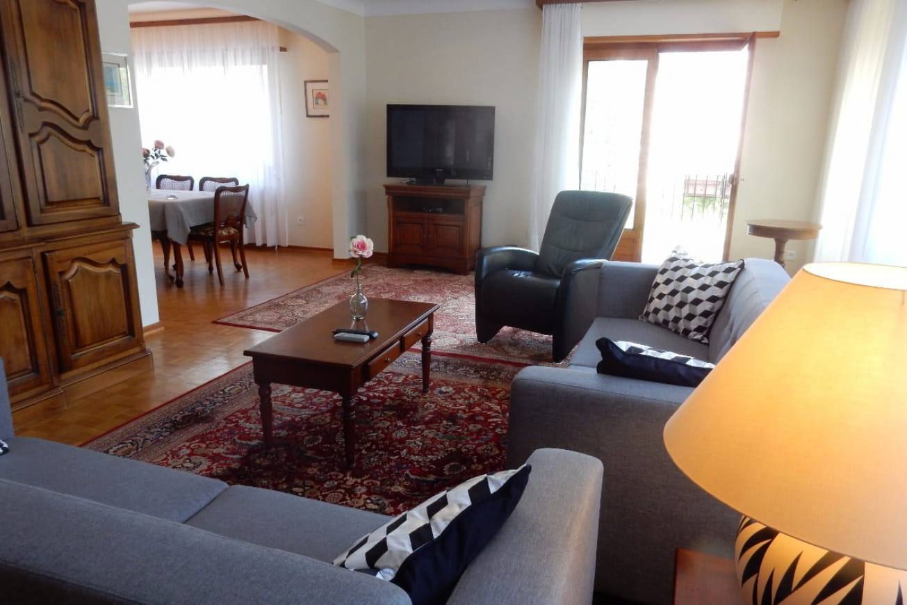 * Un ampio soggiorno con TV a grande schermo, mini impianto hi-fi, 2 divani a 3 posti, un tavolo e 6 sedie e una libreria con materiale da lettura,