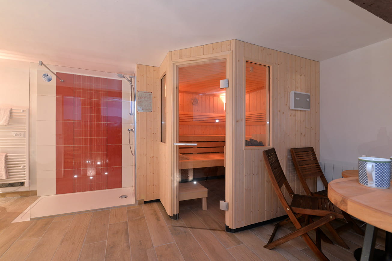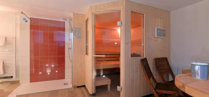 L'alloggio dispone anche di un soggiorno con un arredamento originale, lavorato con i bottai. Una piccola cucina attrezzata si apre sul soggiorno. Questo comprende un salotto con divano in pelle, minibar e TV a schermo piatto con lettore. C'è anche una zona pranzo con un tavolo per 6 persone di fronte a un bovindo. Potrete godere di una vista mozzafiato sulla campagna circostante.