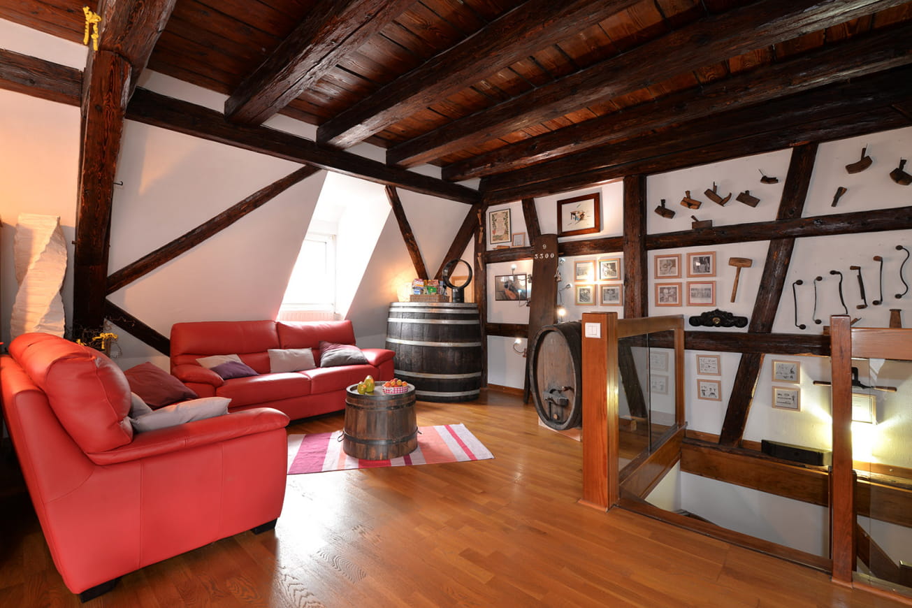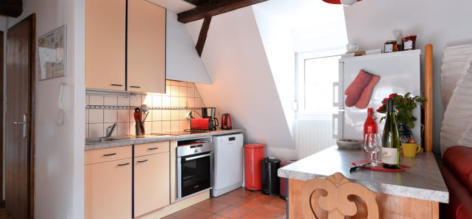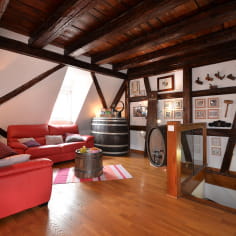 Le Toit des Tonneliers si trova al 3° e 4° piano di una tipica casa alsaziana. Questo duplex di 75 m² offre una splendida vista sul magnifico paesaggio medievale del villaggio e sulle sue principali attrazioni. Offre 3 zone notte ben attrezzate e arredate con gusto, tra cui una camera matrimoniale, una doppia e una singola. Il bagno è dotato di doccia, due lavandini e una zona lavanderia.