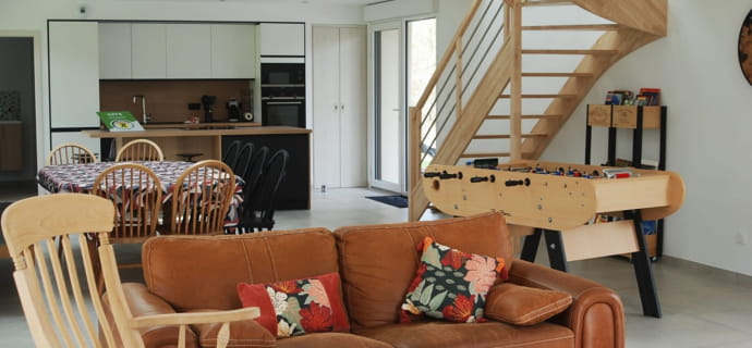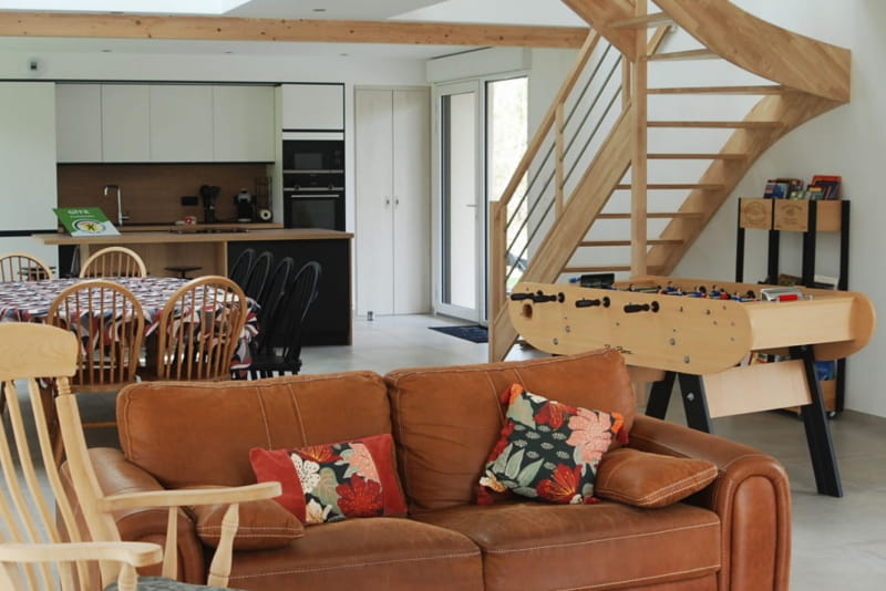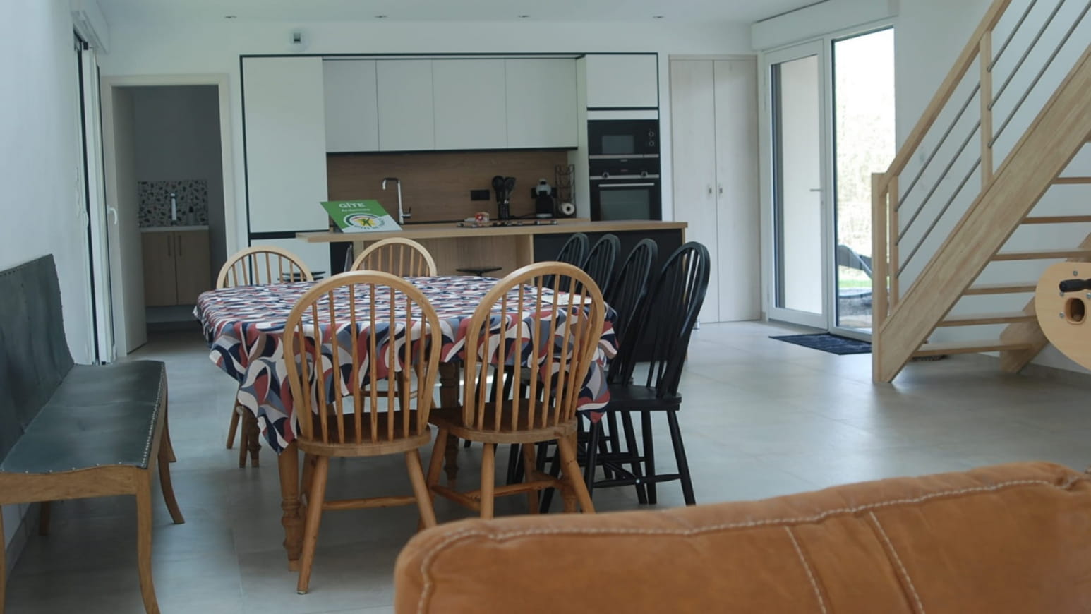 Con i suoi 160 m² e 3 camere da letto, questo gîte può ospitare fino a 10 persone. Al piano terra, troverete un ampio soggiorno con calcio balilla, un accogliente salotto e una cucina completamente attrezzata. Al piano superiore, 3 accoglienti camere da letto offrono diverse possibilità di dormire, perfette per grandi e piccini. 2 bagni con doccia e 3 WC garantiscono comfort e praticità. La casa è dotata di lavatrice, asciugatrice e lavastoviglie. La casa è riscaldata da una pompa di calore, per un comfort ottimale in tutte le stagioni.