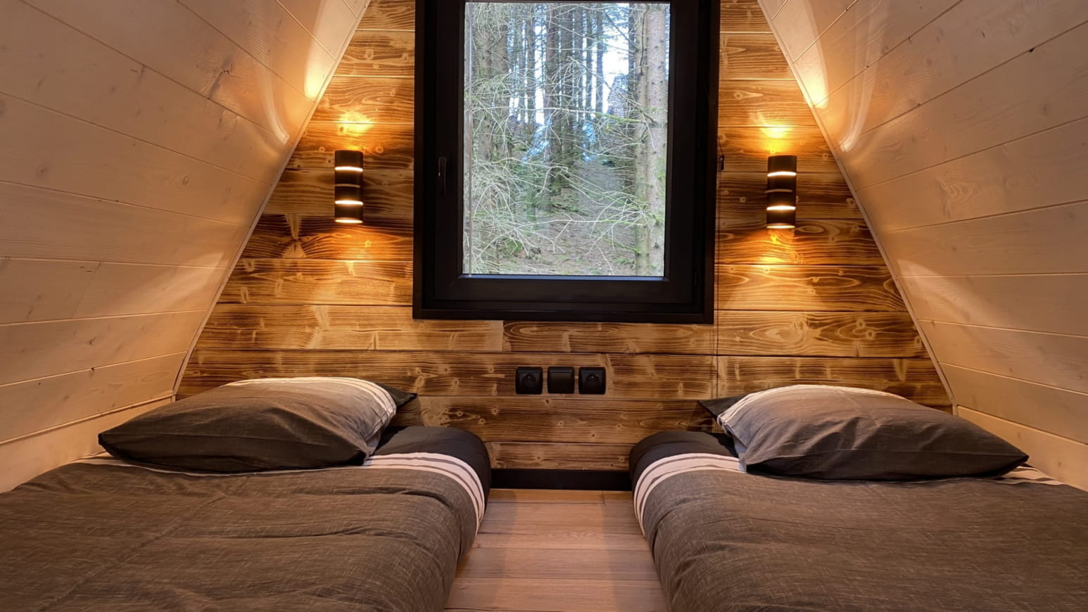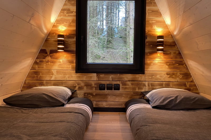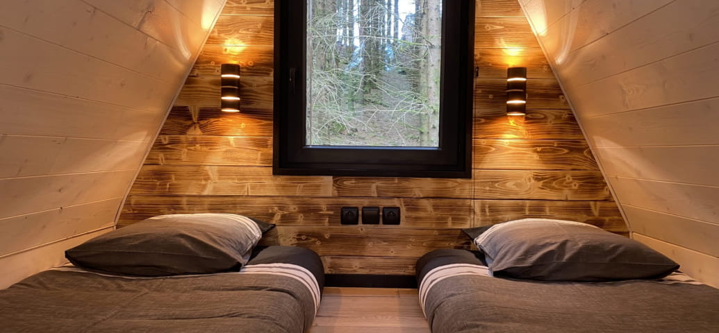 Questo chalet a forma di A, con una superficie di 20 m², è un’ode all’ecologia, completamente autosufficiente grazie a pannelli fotovoltaici, un sistema di trattamento delle acque e servizi igienici a secco. Aprite le porte e scoprirete un interno caldo e accogliente. Progettata per ospitare comodamente fino a 4 persone, è ideale per una vacanza in famiglia o una fuga romantica.