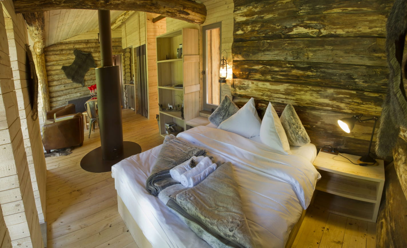 La spaziosa (65 m²) e accogliente Trapper’s Cabin vi offre un magico tête-à-tête con i lupi bianchi dell’Artico. Può ospitare fino a 6 persone e dispone di una stufa a legna per serate accoglienti.