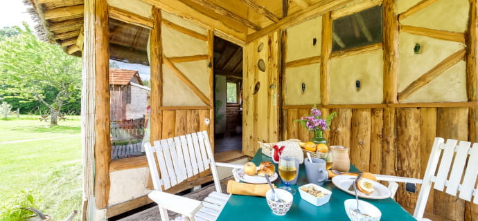La capanna di paglia vi accoglie in un accogliente bozzolo con un interno confortevole. È realizzata con terra, legno, paglia, erica e canne accuratamente selezionate. Sarete sedotti dalla sua semplice eleganza. I materiali naturali le conferiscono un’atmosfera calda. Senza dimenticare i piccoli dettagli che fanno la differenza, come le bottiglie di vetro colorate incorporate nella stecca.