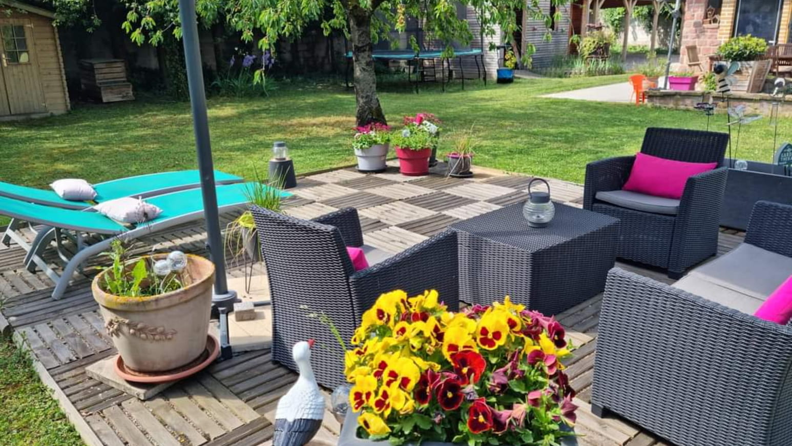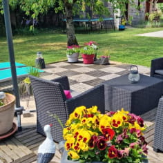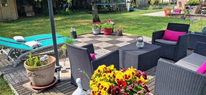 Buiten wacht ook een prachtige tuin van 1000m² op u met meubilair en een barbecue, ideaal om te grillen met familie of vrienden. Geniet bij mooi weer van het terras, speel een partijtje tafeltennis of petanque op de jeu de boules baan, en laat uw kinderen vrijuit spelen in de speeltuin. Dit volledig omheinde terrein is een plek van ontspanning en recreatie die uw veiligheid en gemoedsrust gedurende uw hele verblijf garandeert.