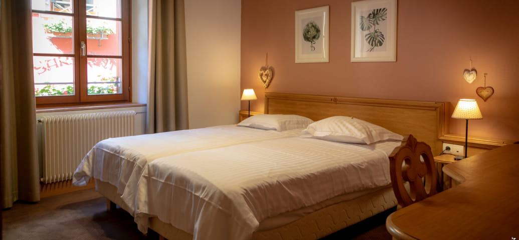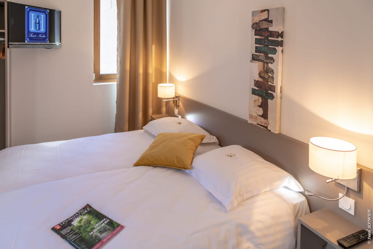 Hôtel Saint Nicolas** biedt u een verblijf op basis van halfpension in zijn prachtige Elzasser huis. Achter de deuren van de vakwerkhuizen, ingericht in de stijl van die tijd, geniet je van een verblijf vol rust en kalmte. In de kamers kunt u genieten van de rustige, lawaaivrije omgeving van de middeleeuwse stad. Ze zijn goed ingericht en volledig uitgerust om uw comfort tijdens uw verblijf te garanderen. Ze zijn voorzien van gezellig beddengoed en kleine accessoires die het verschil maken.