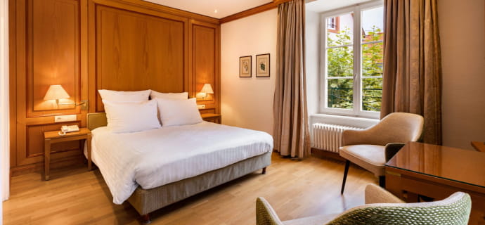 Ontdek voor één nacht het comfort van de tweepersoonskamers Deluxe in hotel À La Cour d'Alsace en trakteer uzelf op de wellnessruimte. Dit 4-sterrenhotel ligt in de middeleeuwse stad Obernai, tussen Straatsburg en Colmar, en biedt je een ongeëvenaard moment van ontspanning.