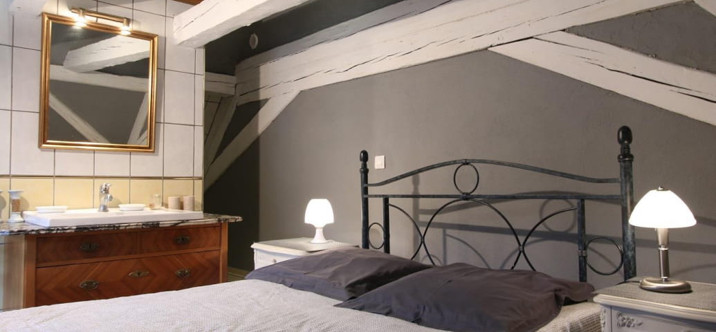 La Cigogne Blanche heeft een oppervlakte van 50 m2 voor 2 personen. Op de eerste verdieping bereikt u uw accommodatie. U zult verrast zijn om de woonkamer te ontdekken met zijn zichtbare balken en smaakvol ingericht: elk voorwerp is zorgvuldig geplaatst om een warm effect aan de plaats te geven.