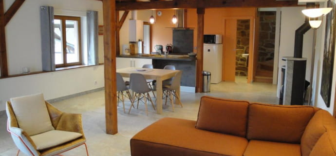 De gîte is onafhankelijk toegankelijk vanaf een omheinde binnenplaats beplant met bomen, via een doorgang naar buiten. Het eerste niveau bestaat uit een woonkamer die uitkomt op een ingerichte keuken en een eethoek. De bovenverdieping is geschikt voor maximaal 5 personen in twee slaapkamers, een met een tweepersoonsbed (160×200 cm) en de andere met drie bedden (twee van 90×200 cm en een van 90×190 cm op de mezzanine). Elke slaapkamer heeft een eigen badkamer (Italiaanse douche, wastafel, toilet). De bedden zijn opgemaakt bij aankomst en handdoeken en huishoudlinnen zijn aanwezig.
