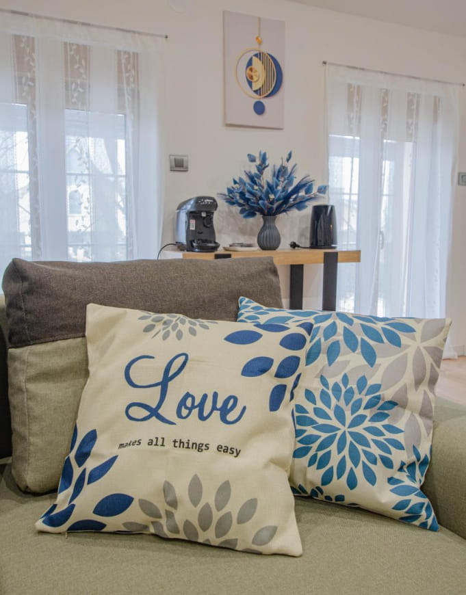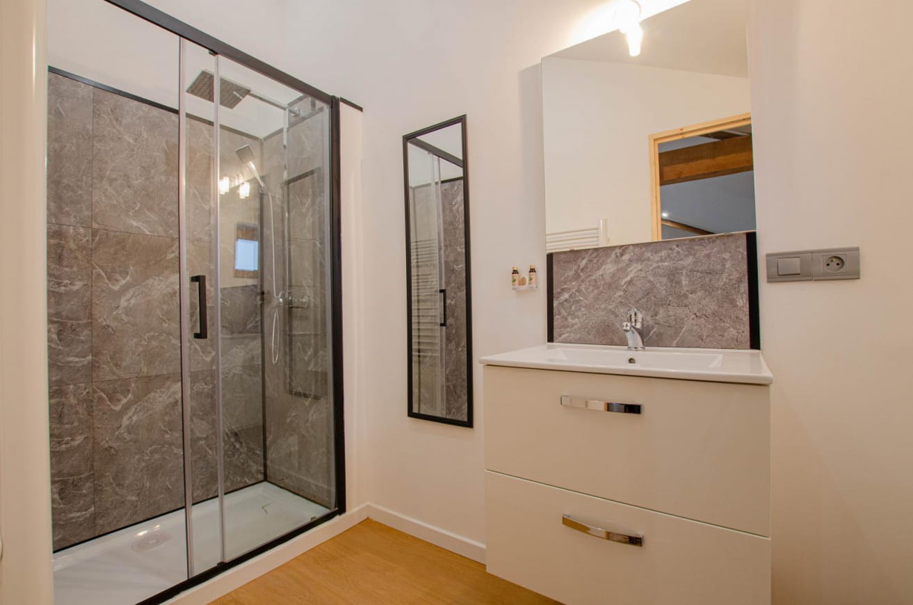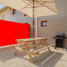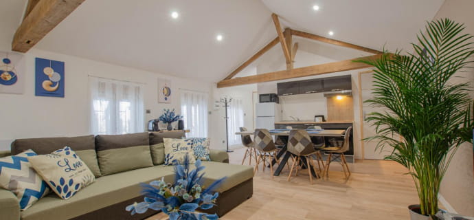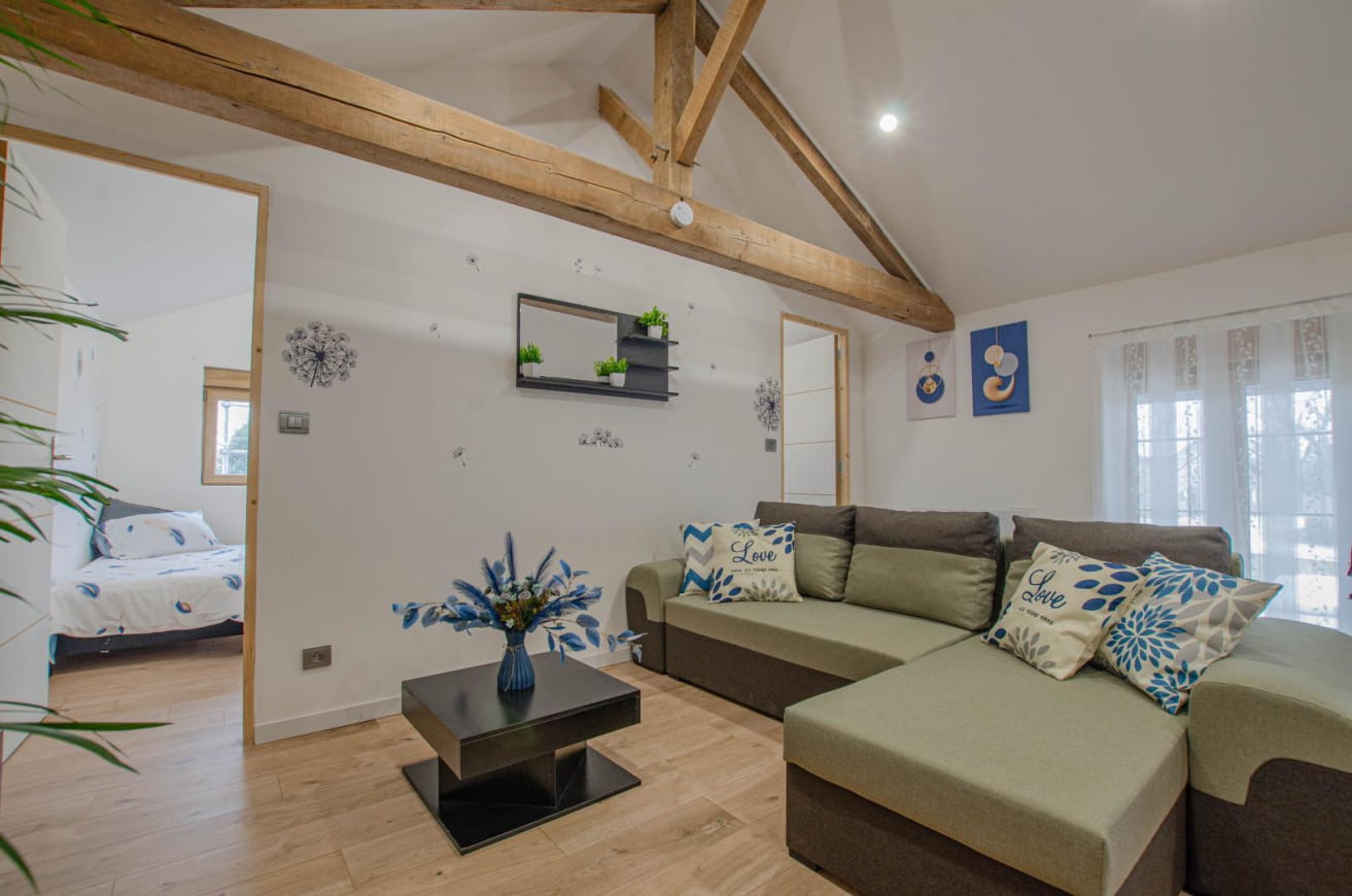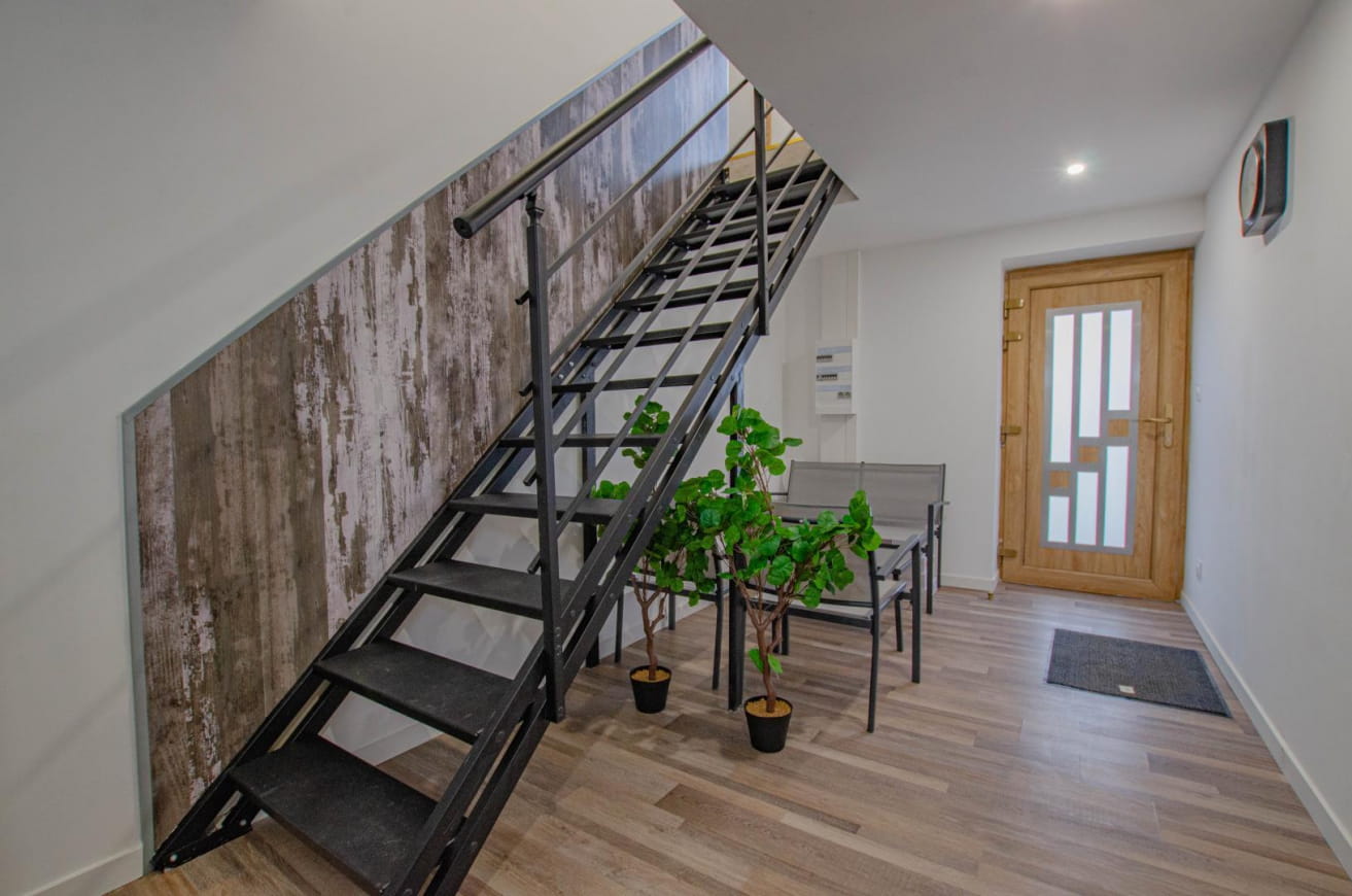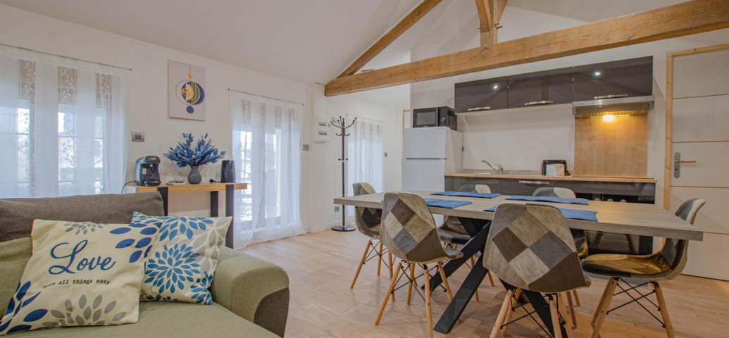 Boven vind je een woonkamer met een ingerichte keuken die uitgeeft op een salon/woonkamer met een slaapbank (mogelijkheid voor 2 extra bedden tegen een toeslag van €10/nacht), een ruime driepersoonskamer (2 x 90×200 bedden die kunnen worden opgemaakt tot een tweepersoonsbed of aparte bedden + 1 x 90×190 bed), een doucheruimte (douche, wastafel) en een aparte wc. Op de begane grond vind je een gemeenschappelijke ruimte met een wasruimte en een ontspannende lounge met bordspellen en toeristische brochures. Buiten vind je een parkeerplaats, een privéterras (tuinmeubels, parasol, barbecue) en een omheinde tuin om te delen. Vanaf half mei is er gratis een fitnessruimte voor de gites beschikbaar, evenals een wellnessruimte met sauna/hammam/jacuzzi/theehoek/sanitair (toeslag van € 80 voor een sessie van 2 uur). Gemeenschappelijk ZWEMBAD beschikbaar in juli/augustus. Gemeenschappelijke zaal in de buurt.