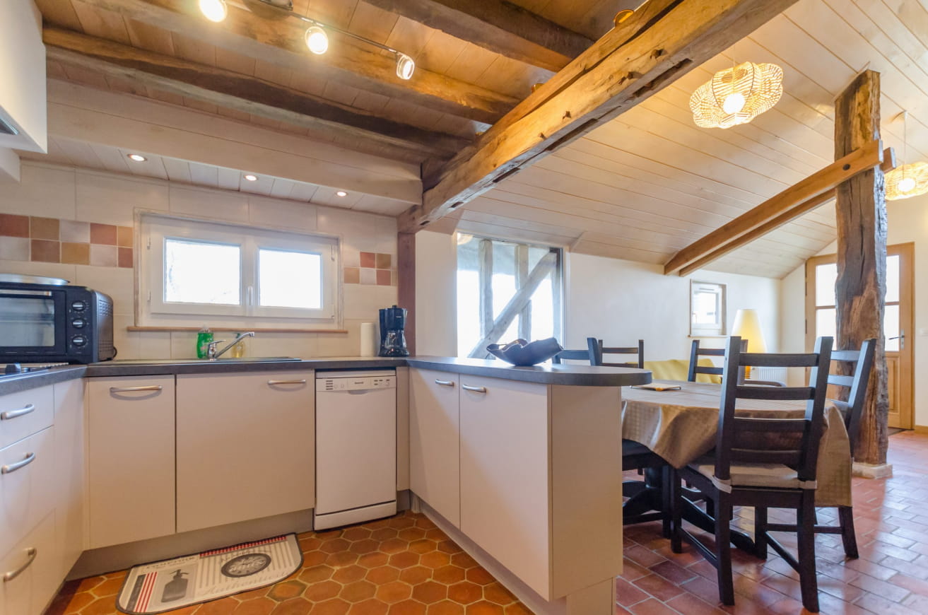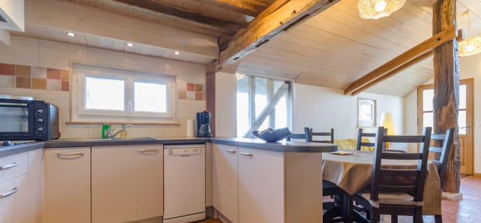 Op de begane grond heeft de gîte een woonkamer met zithoek en ingerichte kitchenette, een doucheruimte met inloopdouche en een aparte wc. Boven is er een kleine leeshoek en speelhoek op de mezzanine, 2 tweepersoonskamers (bedden van 140×190) en een kamer met twee enkele bedden (2 bedden van 90×190 die kunnen worden opgemaakt tot een tweepersoonsbed), en een doucheruimte met wc.