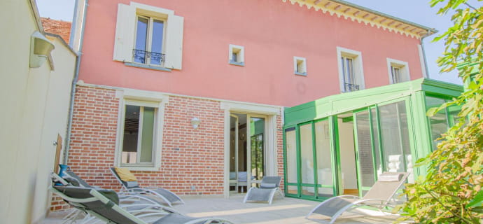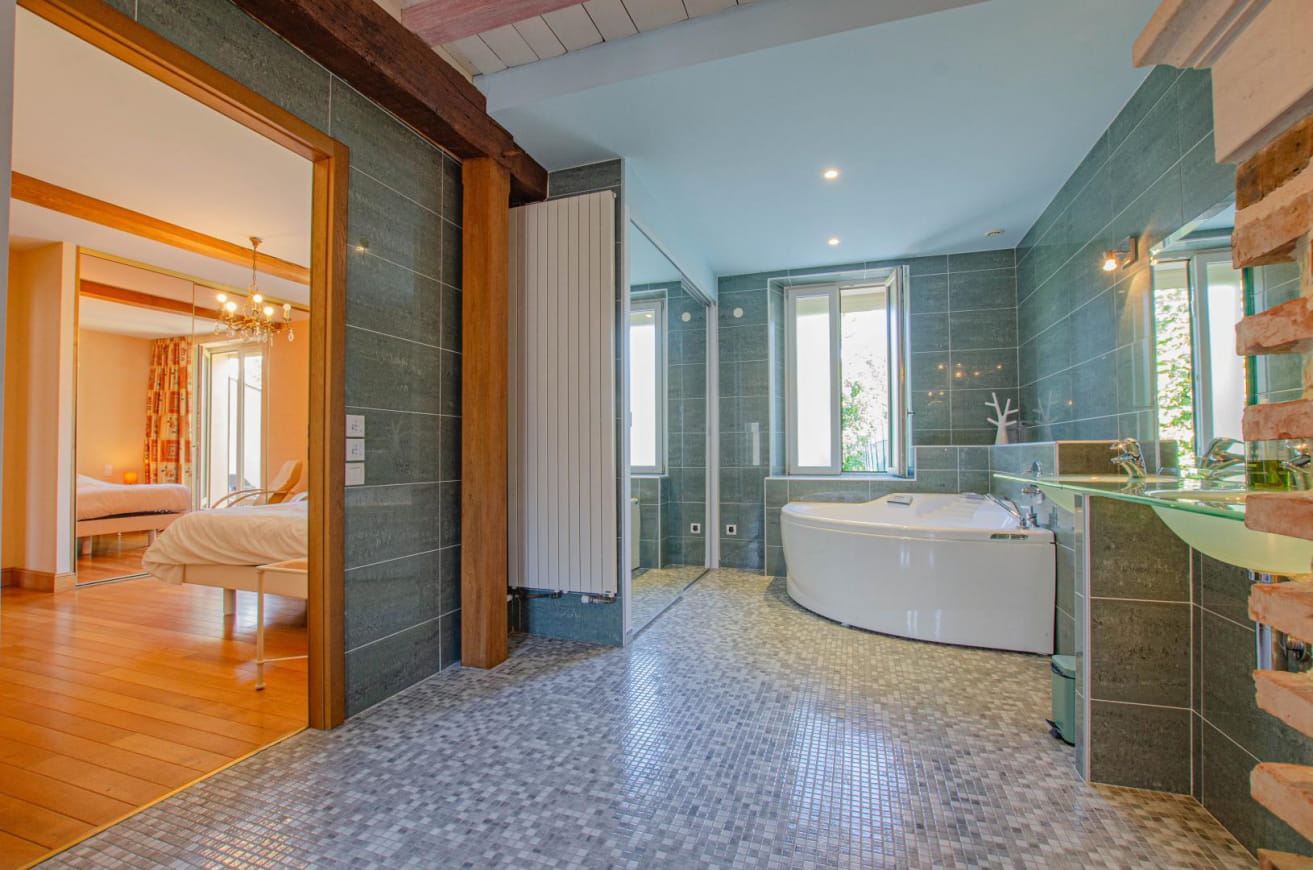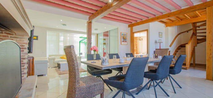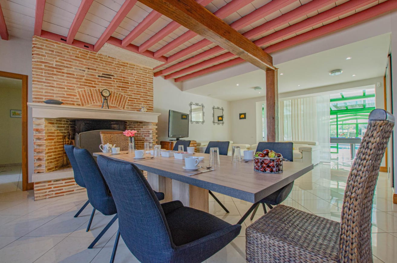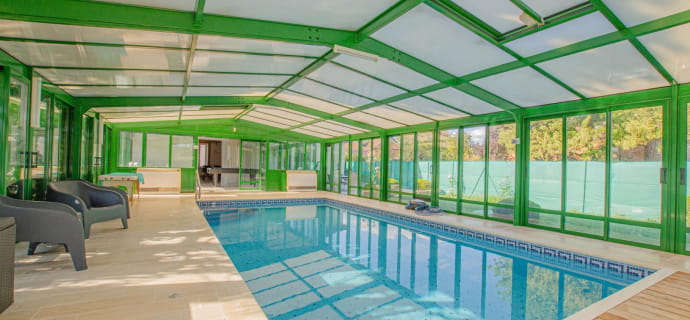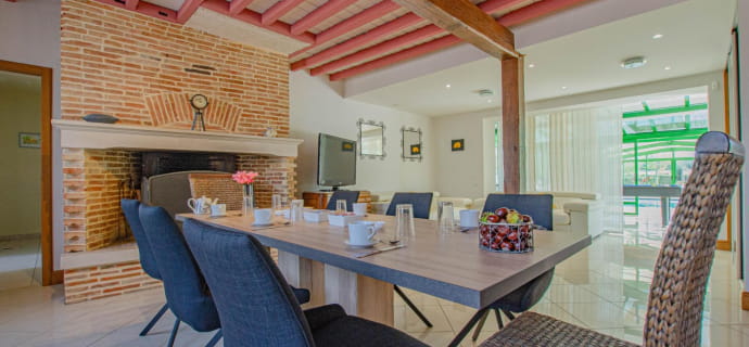 Op de begane grond vindt u een woonkamer met eethoek, salon, ingerichte keuken, doucheruimte (douche + wc), serre met airconditioning en biljarttafel, grote slaapkamer (bed 180×200) toegankelijk voor mensen met beperkte mobiliteit met een eigen badkamer (Italiaanse douche + dubbele wastafel + bubbelbad + wc) en terras met ligstoelen, aparte wc. Boven een tweepersoonskamer (140×190) met televisie, een gezinskamer voor 4 personen (bed van 180×200 + 2 bedden van 90×190), een tweepersoonskamer (van 2 bedden van 90×200 kan een tweepersoonsbed worden gemaakt). Een overdekt privézwembad ALLEEN TOEGANKELIJK van 01/05 tot 30/09 (4m x 8m – diepte 1m35), verwarmd door de zon in het seizoen. Een verwarmingstoeslag van 15€/dag wordt aangerekend van 01/10 tot 30/04.