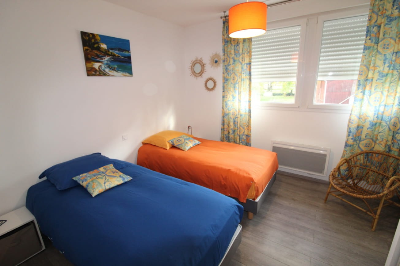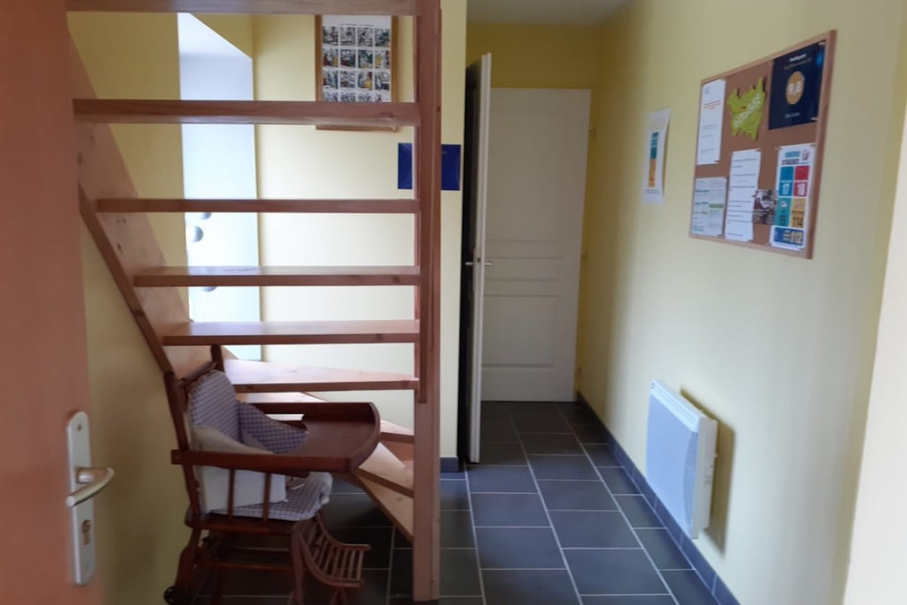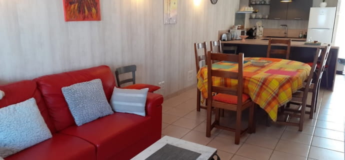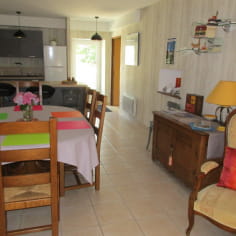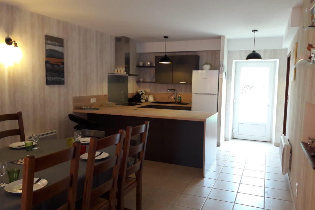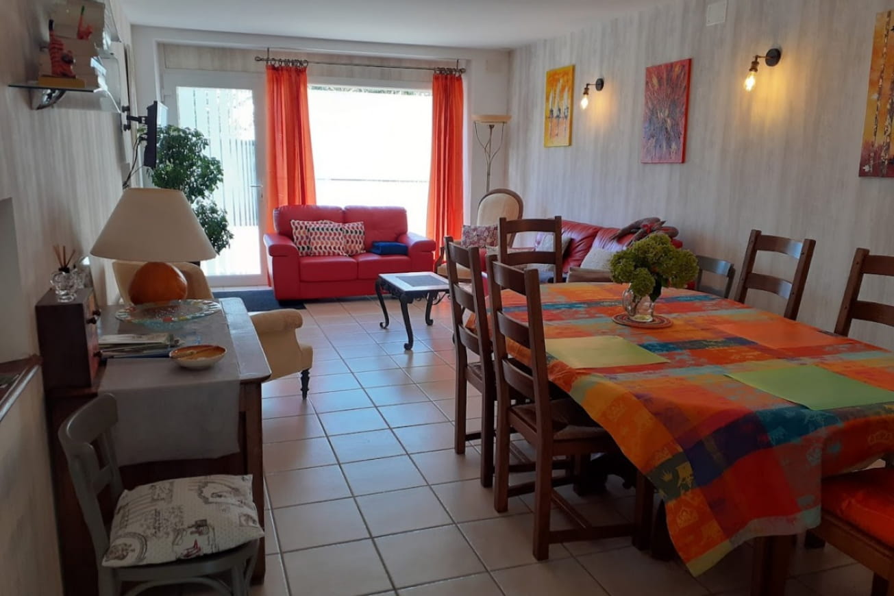 De begane grond beschikt over een volledig uitgeruste keuken (oven, magnetron, vaatwasser, koelkast, enz.) die uitkomt op een woonkamer met een grote tafel, bank, fauteuil, tv en dvd-speler. Er is ook een apart toilet.