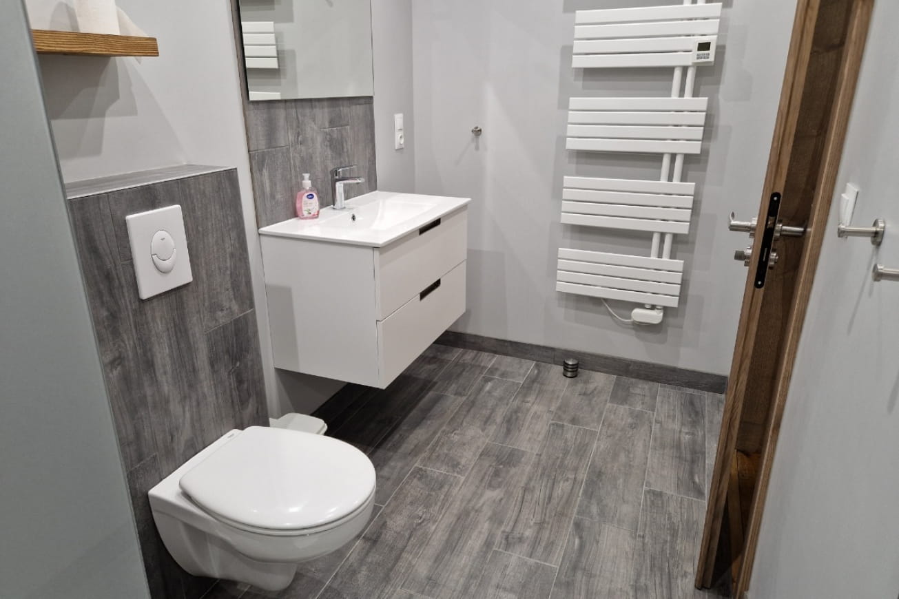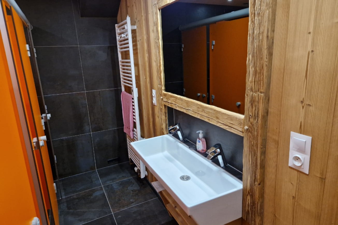 -1 tweede badkamer met 2 aparte douches per cabine, 2 toiletten, 1 urinoir, 1 grote wastafel, 1 elektrisch handdoekenrek.