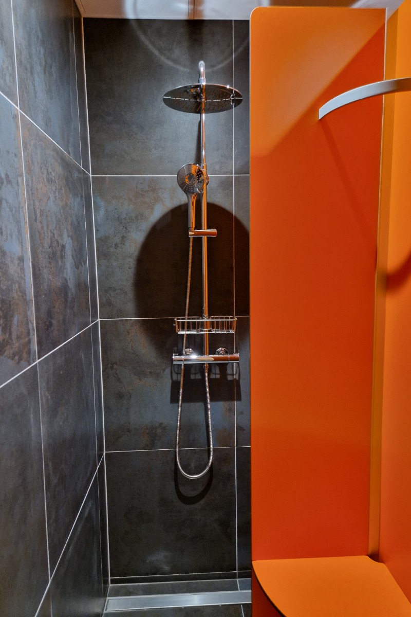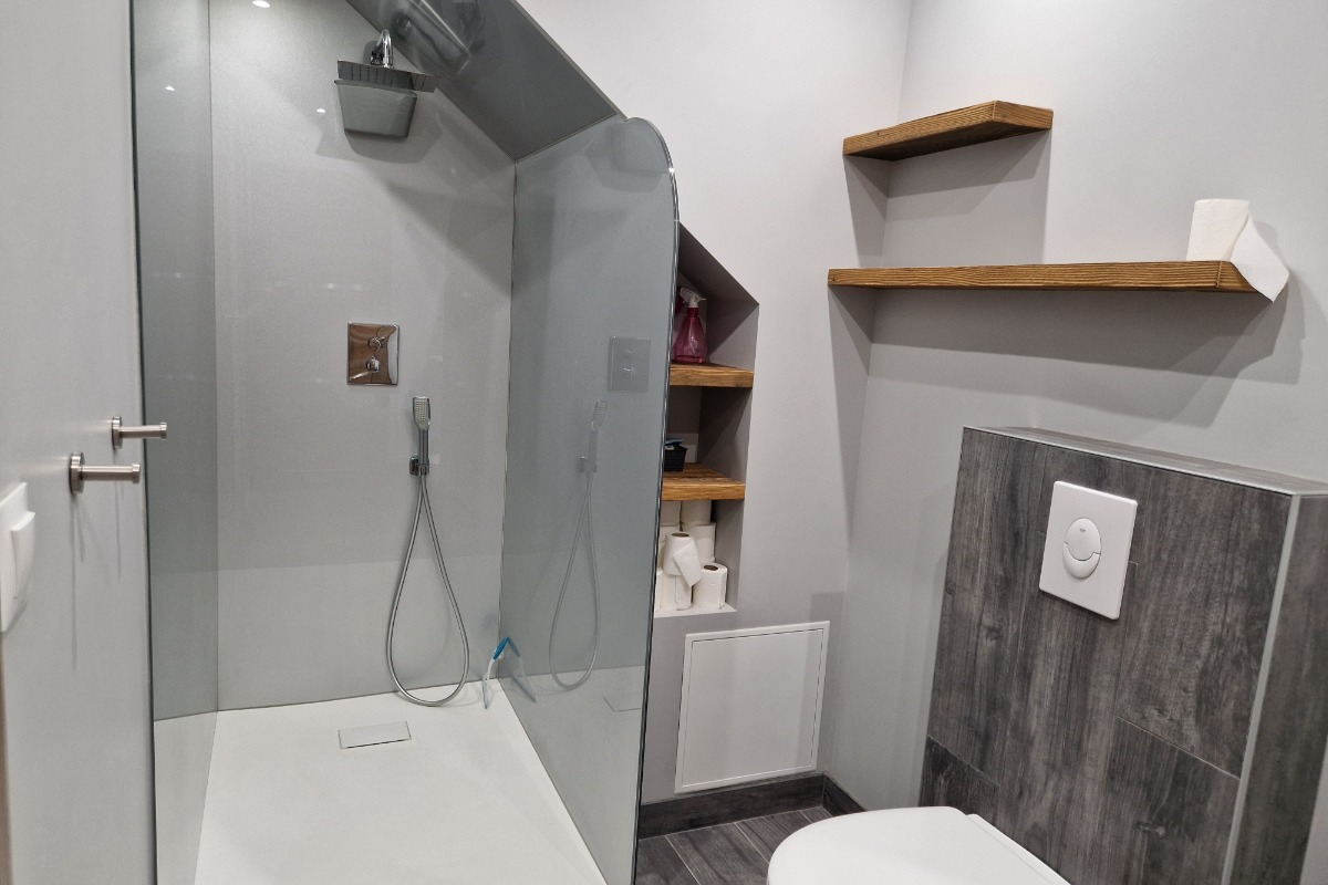 De bovenverdieping heeft ook een doucheruimte met een inloopdouche en WC.