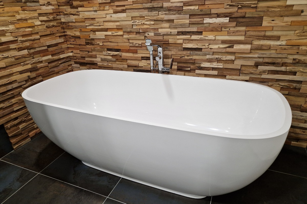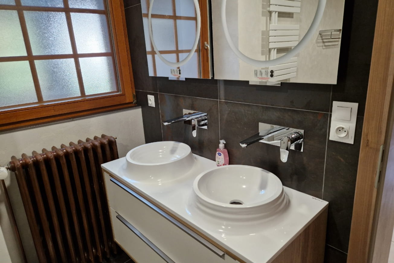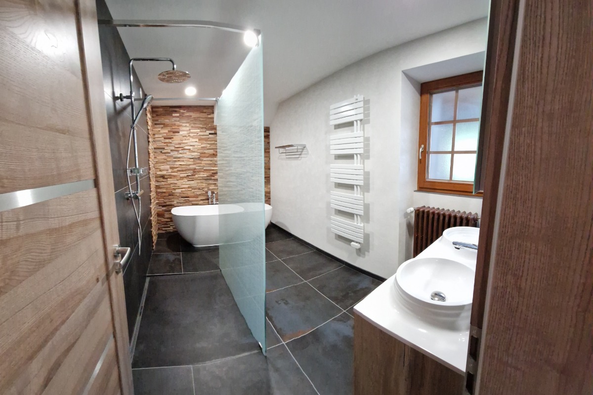 -1 grote badkamer met 1 bad, 1 grote inloopdouche, 1 dubbele wastafel met kasten, 1 elektrisch handdoekenrek.