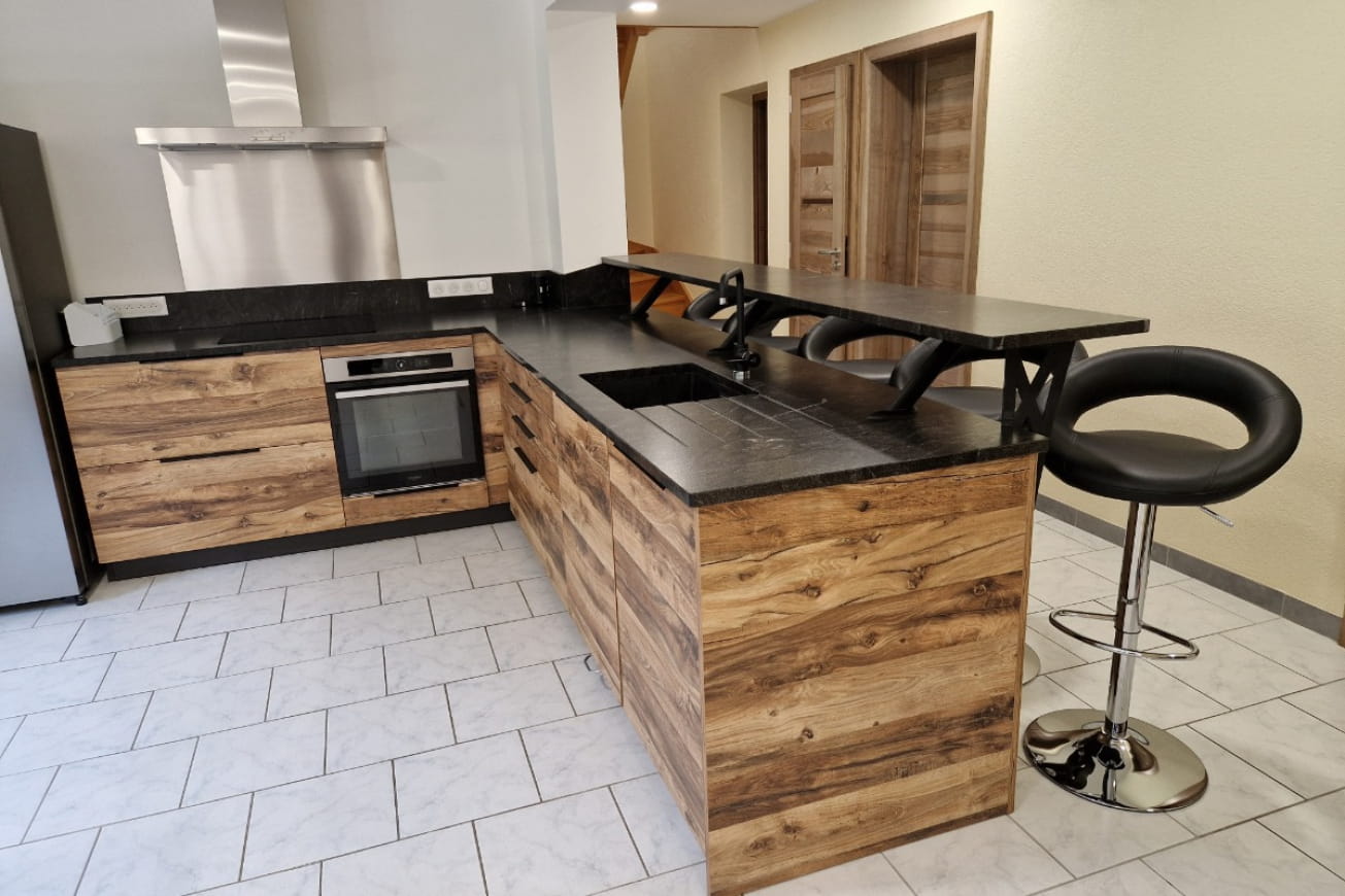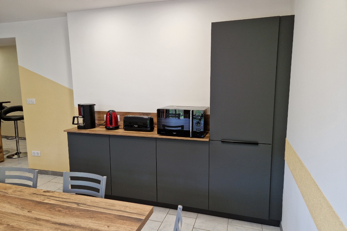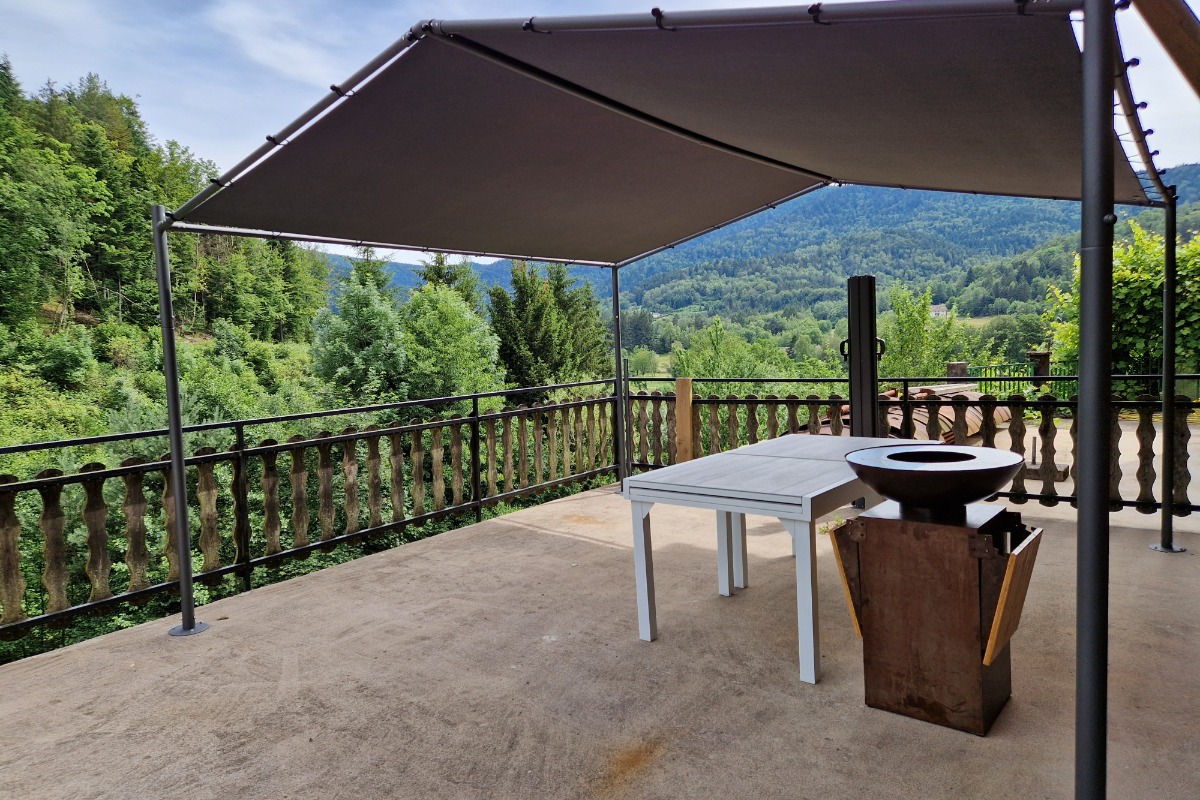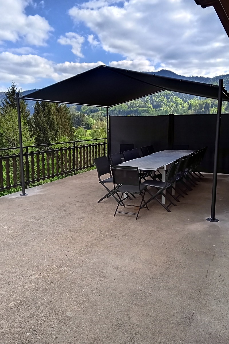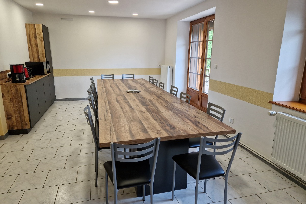 Op de begane grond is er een grote eetkamer die uitkomt op de volledig uitgeruste keuken (1 x 16-plaats vaatwasser, 1 oven, 1 Amerikaanse koelkast, 1 magnetron, 1 koffiezetapparaat, 1 waterkoker, 1 broodrooster, 2 raclette apparaten, servies voor 16 couverts + potten + pannen) en de Amerikaanse bar zodat je kunt genieten van lange maaltijden met familie of vrienden. Deze grote leefruimte komt uit op het terras, dat beschut is door een prieel en een ononderbroken uitzicht biedt op het bos en de bergen, met tuinmeubels en een vuurplaats (2 tafels voor 8 personen, 16 stoelen).