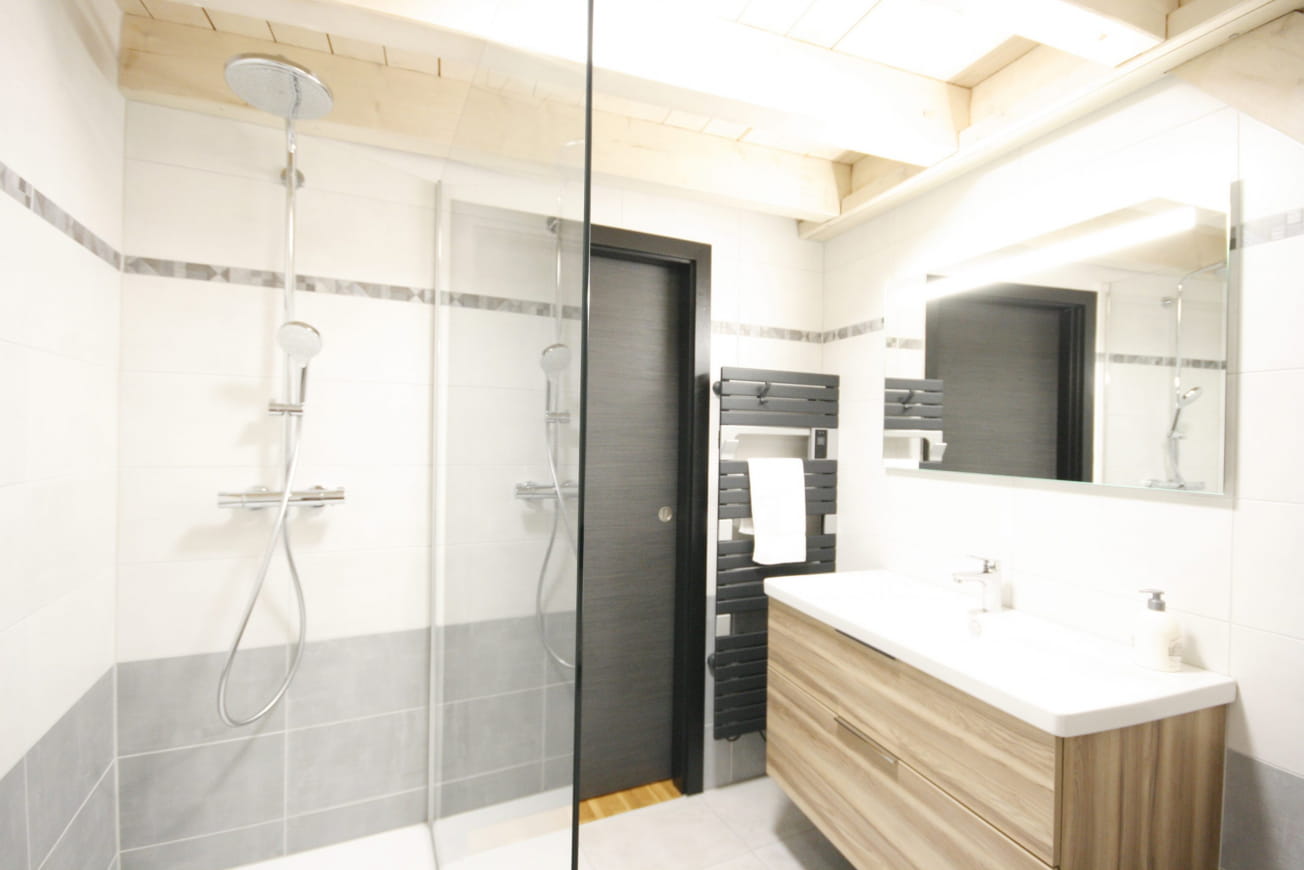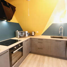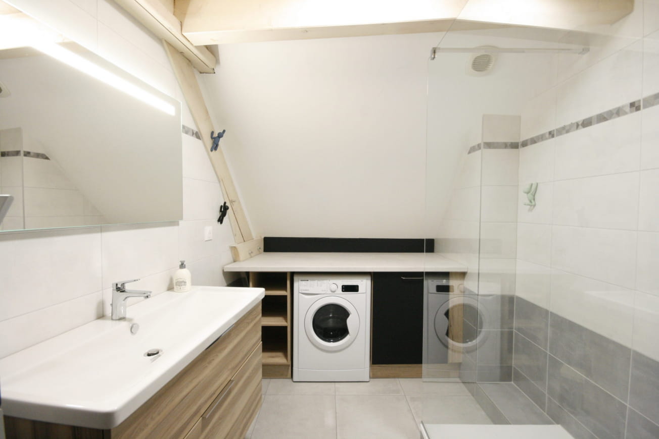 De badkamer heeft een badmeubel, inloopdouche, elektrisch handdoekenrek en haardroger. Een werkblad met opbergruimte en een wasmachine-droger zijn ook beschikbaar om je comfort compleet te maken.