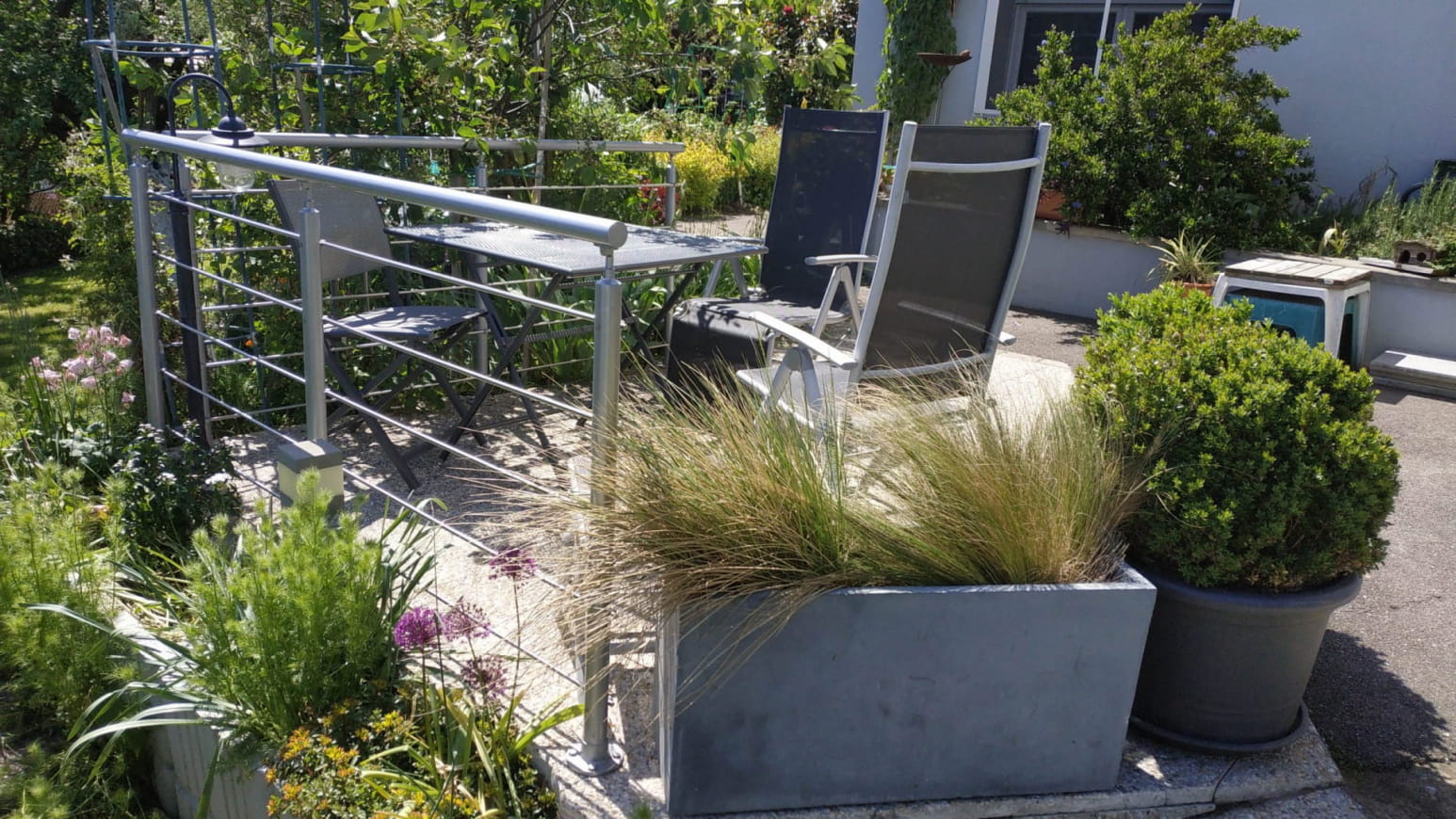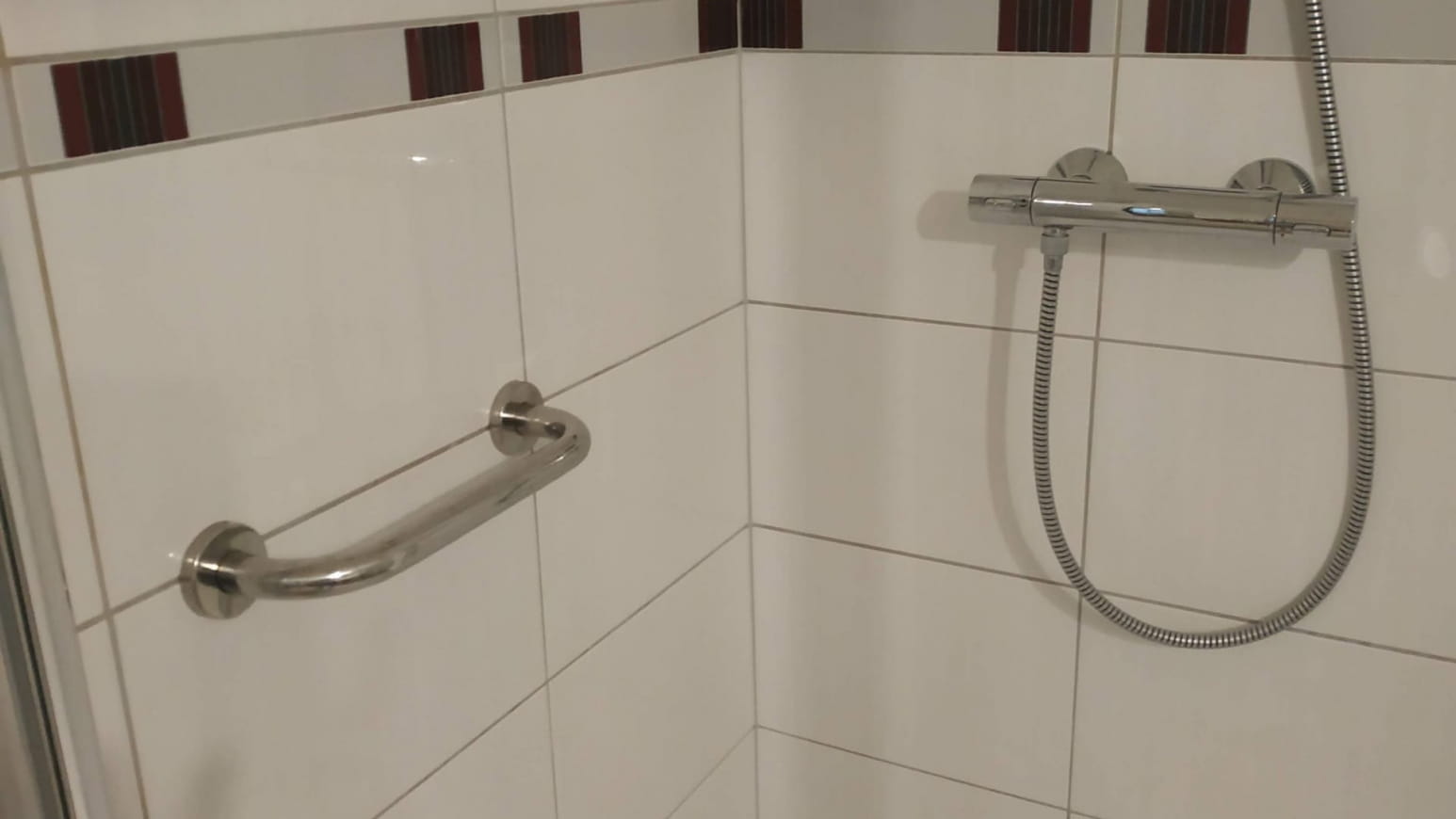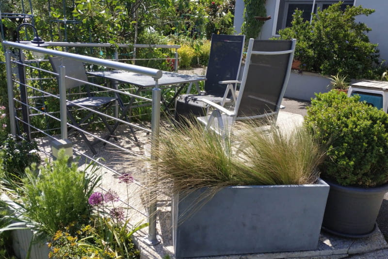 Het is helemaal gelijkvloers, met 2 toegangswegen: via de linkerkant van mijn huis, zonder trappen, en via de parkeerplaats voor de gîte, met trappen en een helling.