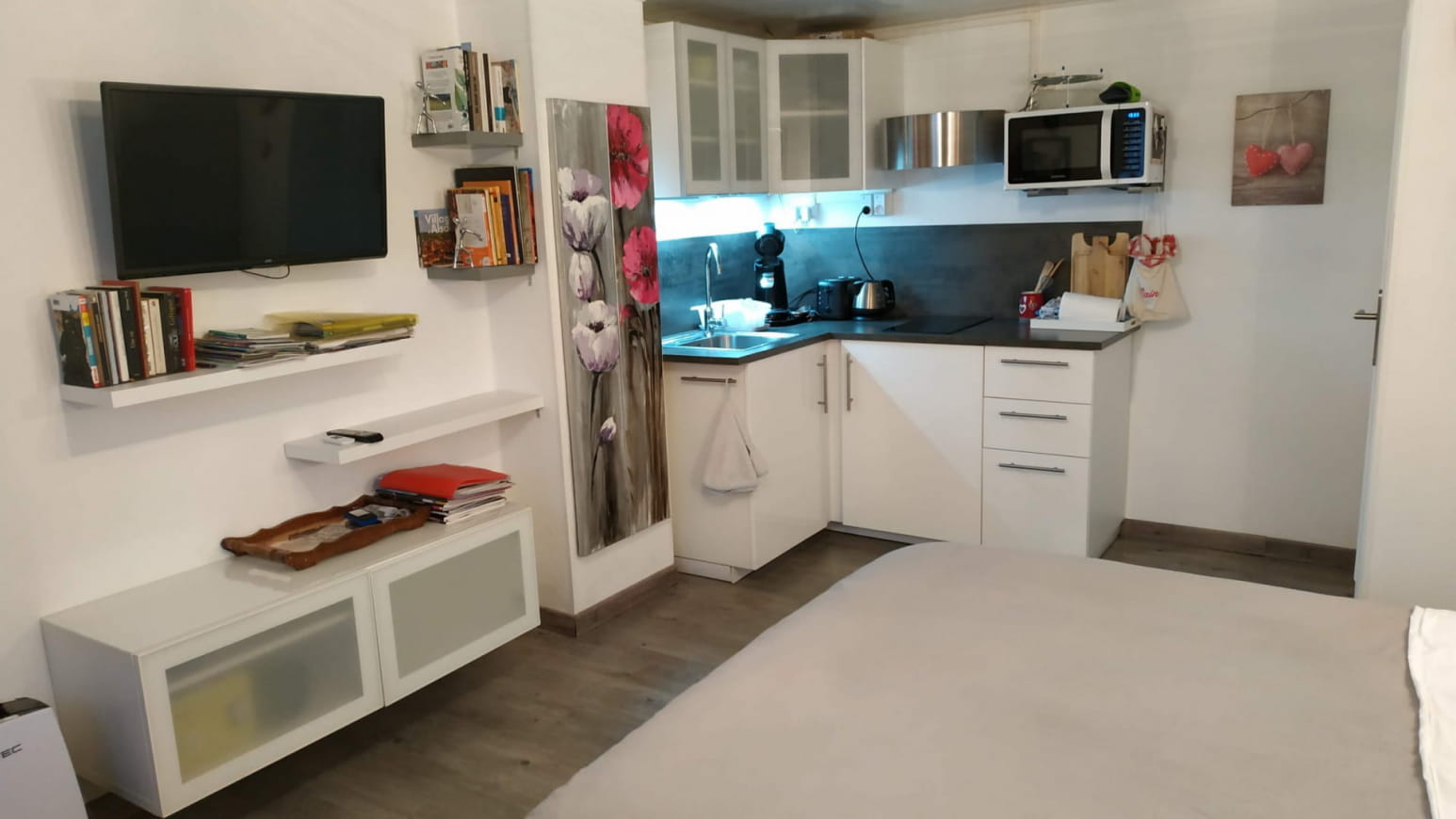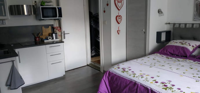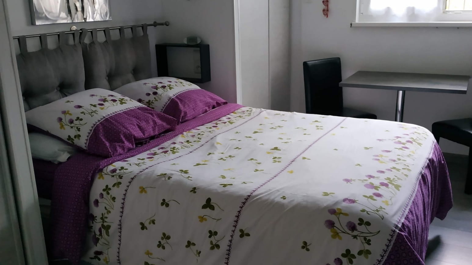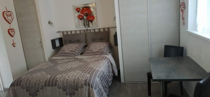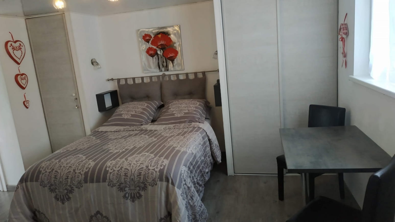 De studio, waarvan de ingang aan de andere kant van het huis is, is een eenpersoonskamer met een grote badkamer en bergruimte, totale oppervlakte 28 m2, bed 140 x 200, goed uitgeruste kitchenette, kasten, geschikt voor een of twee personen.