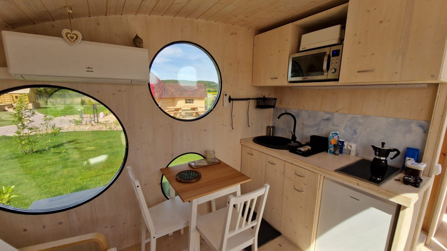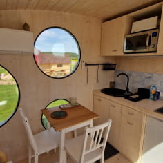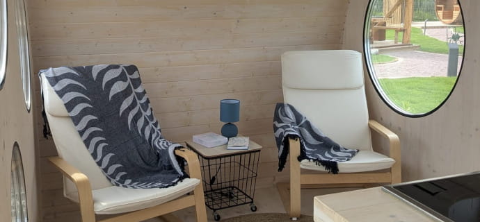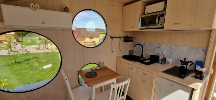 Slaap in de Tiny Bubble waar La Fée de l’Air op je wacht voor een verkwikkend verblijf! Stel je een Tiny Bubble voor met alle comfort van thuis, met bubbels die verschillende uitzichten bieden op het omringende landschap? Eigentijdse accommodatie met airconditioning voor twee personen voor een moment van zenitude, rust en sereniteit. Het is de perfecte plek voor een uitje voor twee, met zijn woonkamer (fauteuils, eethoek, keuken), tweepersoonsbed (160 x 200) en badkamer met douche (toilet en douche).