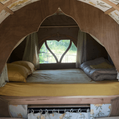 In de kar is een slaap- en zitgedeelte ingericht. De verlichting wordt verzorgd door fotovoltaïsche panelen en je kunt je telefoon opladen. Bovendien kun je je wassen in warm water omringd door sleedoornstruiken. Je kunt je helemaal ontspannen terwijl je geniet van het gezang van de vogels!