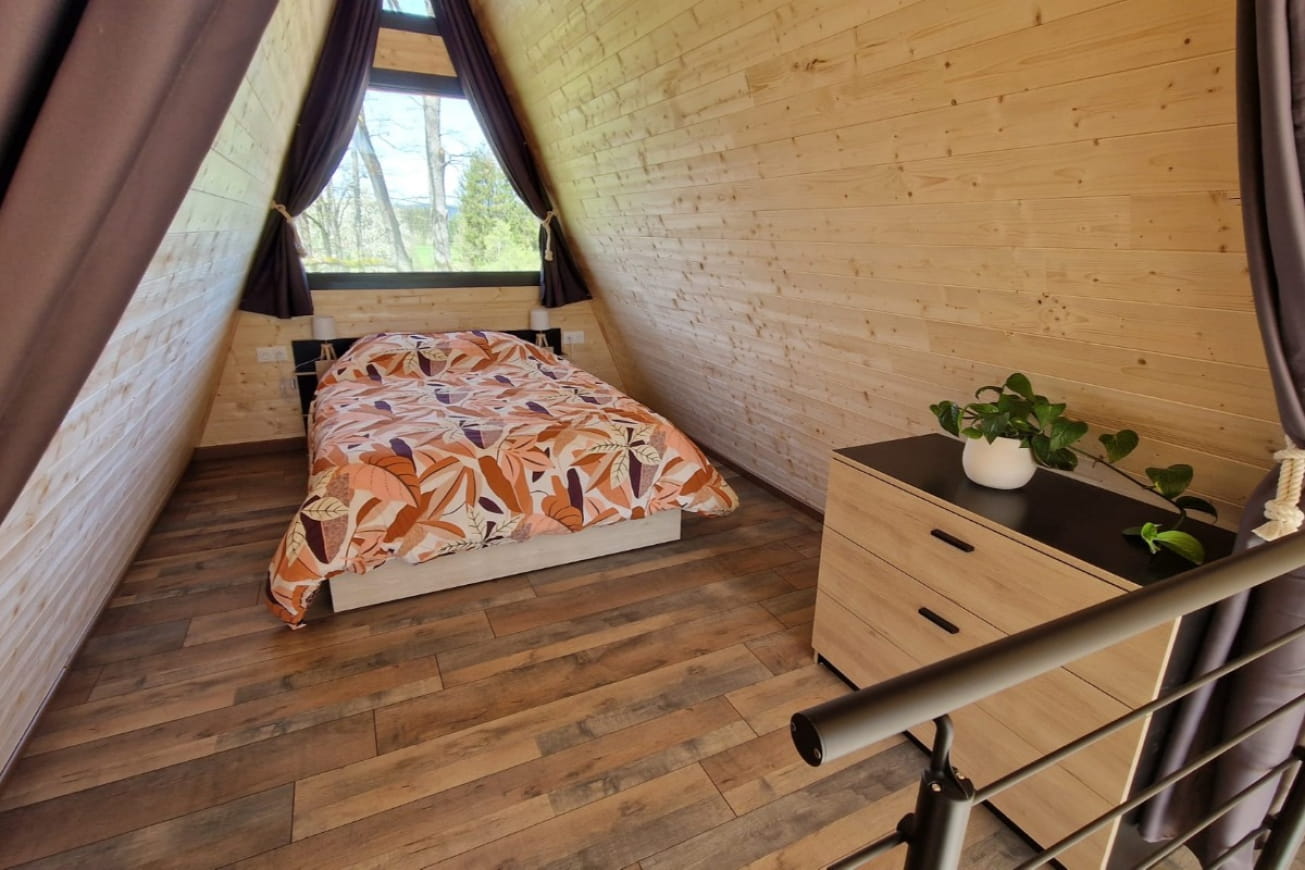 – Mezzanine slaapkamer: Geniet van het panoramische uitzicht op de omliggende bergen vanuit deze comfortabele en lichte slaapkamer.