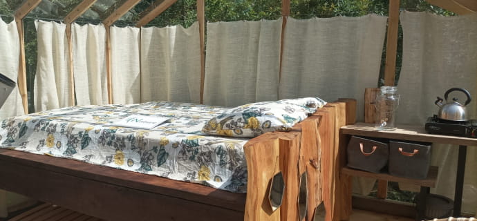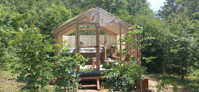 La Cabane du rêveur is geschikt voor maximaal 4 personen, met een bed van 160×200 en 2 bedden van 90×200. Voor je comfort zijn er droge toiletten en een zonnedouche van 20 liter. Je krijgt een natuurlijke zeep aangeboden met het Nature et Progrès certificaat, en beddengoed, handdoeken en schoonmaak aan het eind van je verblijf zijn inbegrepen. Je geniet van een biologisch ontbijt, met kruidenthee, koffie, brood, sap, jam of honing en gemengd fruit, allemaal van lokale en biologische producten.