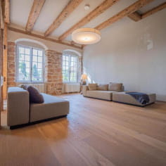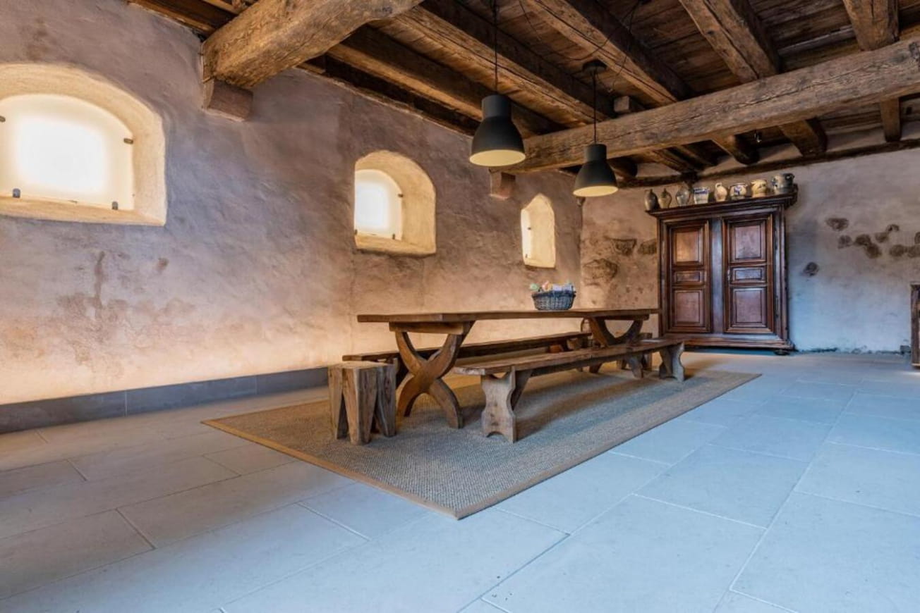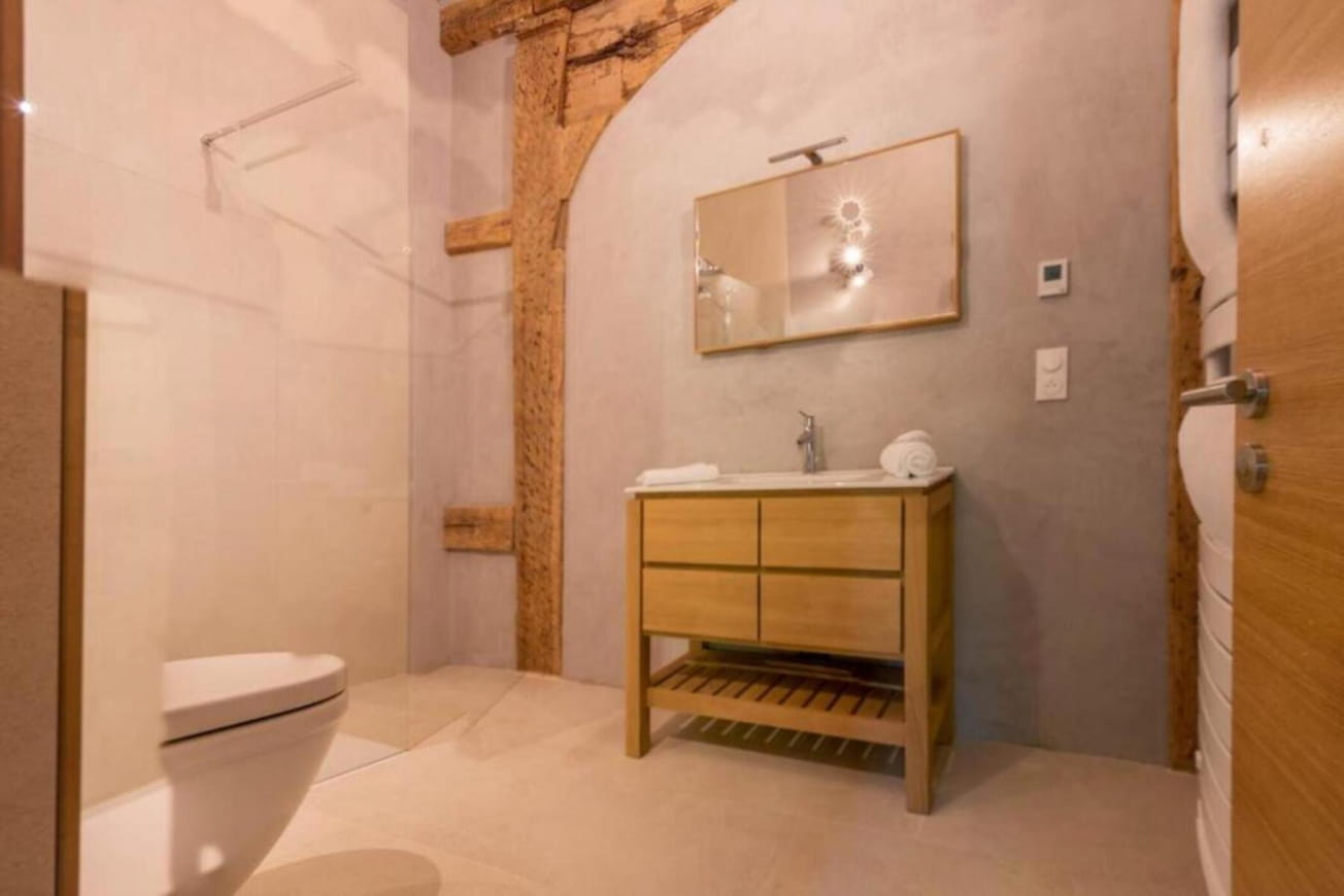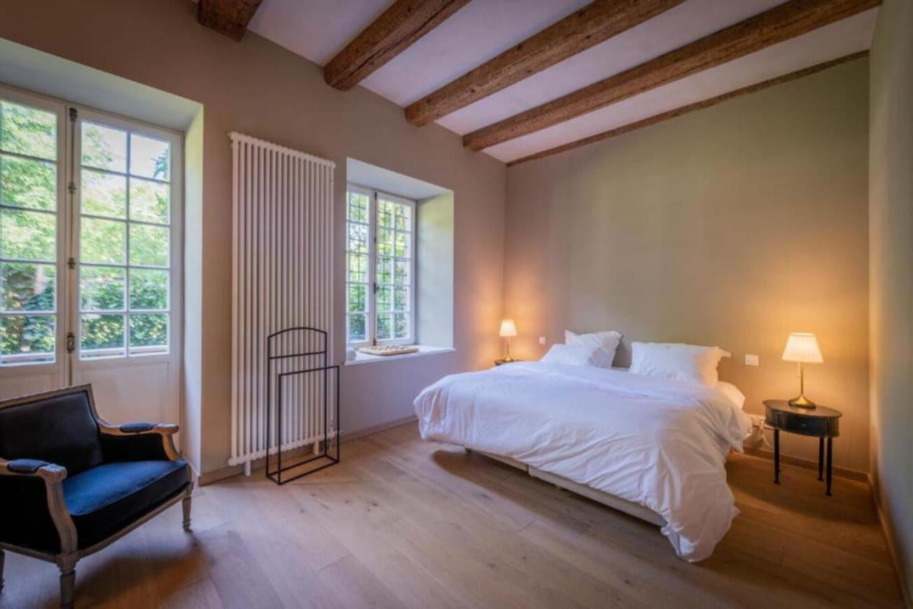 Zodra je aankomt, word je verleid door de charme van de ruwe materialen: oude balken, zichtbare stenen en massief parket verwelkomen je in een intieme, verfijnde sfeer. Op de begane grond vind je een grote, gezellige eetkamer, een volledig uitgeruste keuken van topklasse en een discrete bijkeuken. Dit alles komt uit op een privétuin beplant met bomen, perfect om te ontspannen in de frisse lucht.