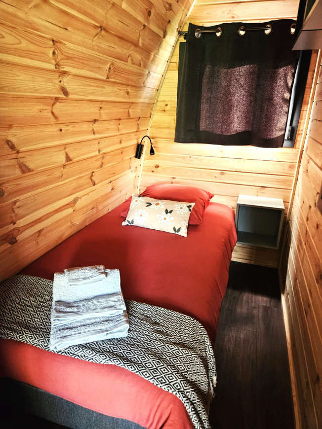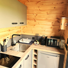 Deze gewelfde houten cocon is geschikt voor maximaal 3 personen. Het heeft een functionele kitchenette, een eethoek, een gezellige woonkamer en twee slaapkamers: een met een tweepersoonsbed en de andere met een eenpersoonsbed. De aangrenzende doucheruimte heeft een douche, wastafel en toilet, en de elektrische verwarming zorgt het hele jaar door voor optimaal comfort.