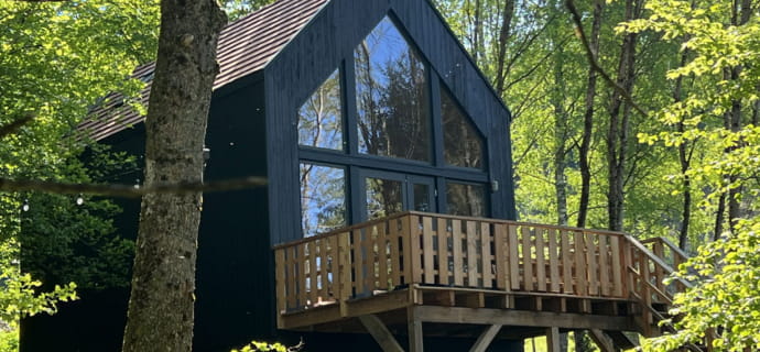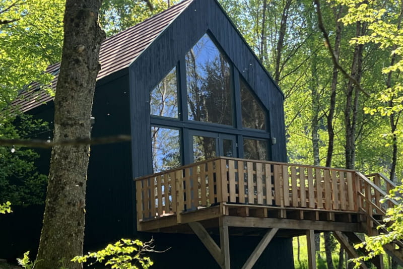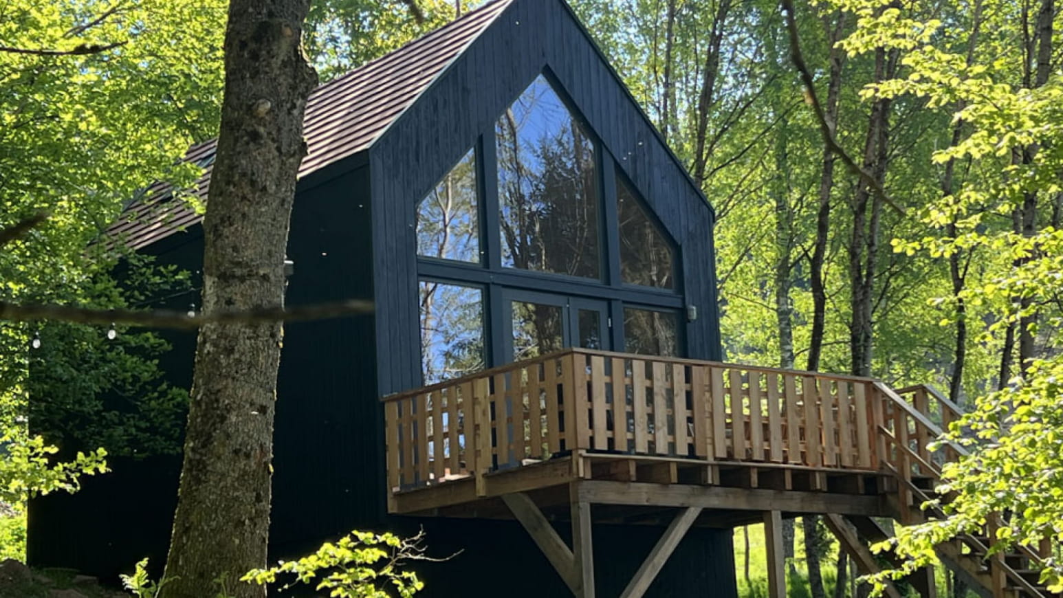 Korte termijn verhuur van 3 eigentijdse lodges op een zeer bebost terrein van ongeveer 2800 m2 met uitzicht op de bergen en het mooie dorpje Saint-Quirin.