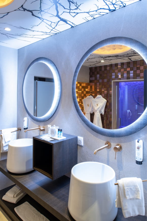 Tijdens je verblijf nodigt de toegang tot de spa en de zwembaden je ook uit om te ontspannen. Tussen de 4 sprankelende zwembaden, de 5 sauna’s, het hammam-tepidarium, het nordic bad, de sensatiedouches, de sprankelende stranden en de hangende rustnesten raak je in een staat van ontspanning. Het terras is ook de perfecte plek voor diepe ontspanning, met een adembenemend uitzicht over het landschap van de Elzas.