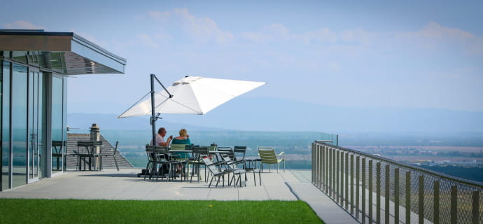 Kom en ontdek onze gloednieuwe kelder en panoramische wijnbar. In een warme en eigentijdse ontvangstruimte kun je door de gangen van onze kelders wandelen en onze wijnen proeven terwijl je van onze schotels met streekproducten proeft. Ons panoramisch proeflokaal biedt een spectaculair uitzicht over de wijngaarden - wat is een betere manier om van een glas Elzaswijn te genieten?