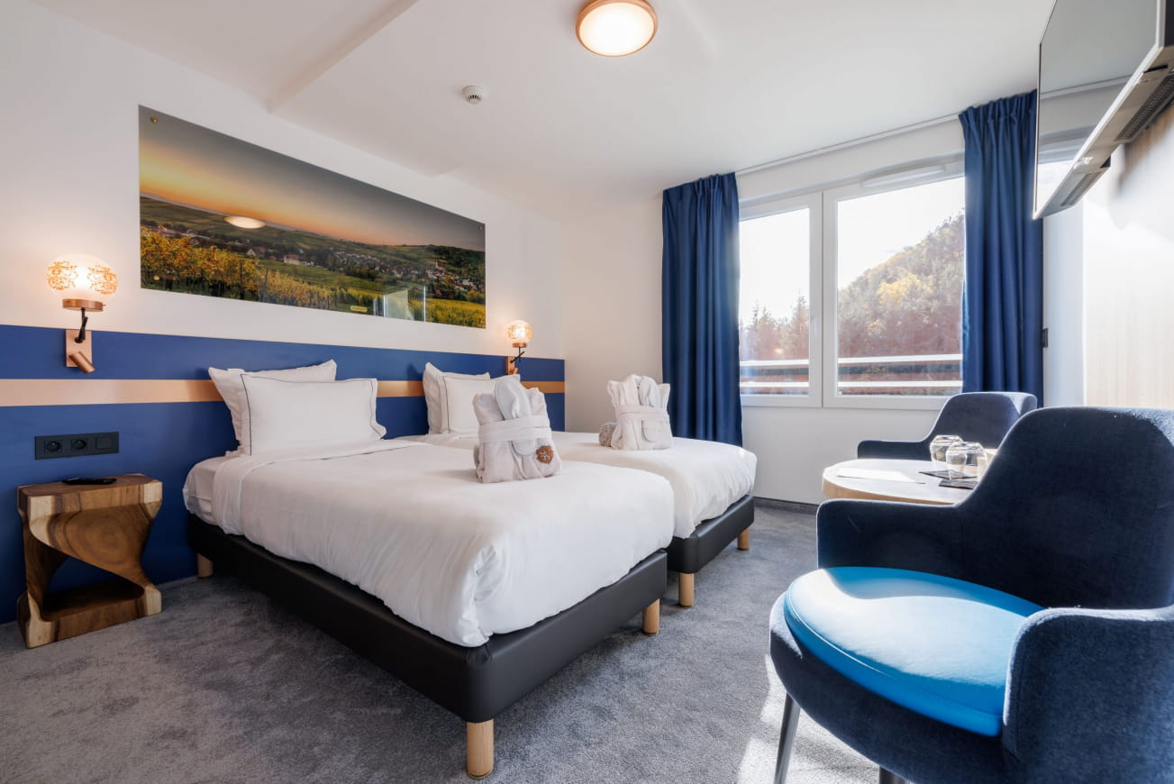 Zodra je aankomt, word je verwelkomd in een Superior Tweepersoonskamer, een echte weerspiegeling van de omringende natuur en de wijngaarden van de Elzas. De zachte tinten en edele materialen van deze kamer creëren een rustgevende sfeer, ideaal voor een goede nachtrust. In deze cocon van rust kun je nieuwe energie opdoen.