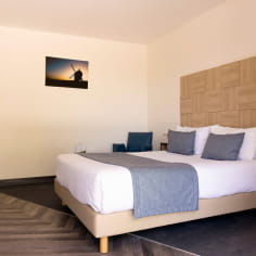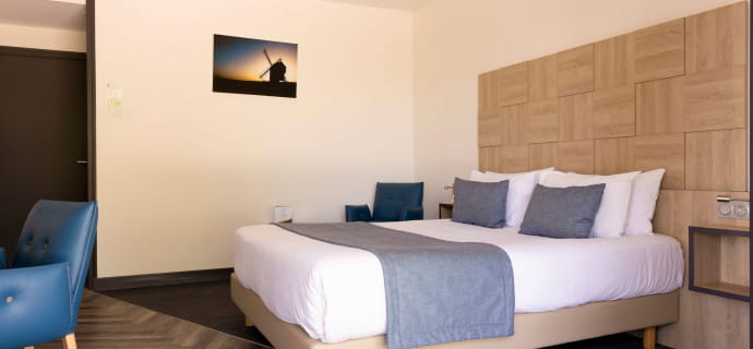 De 42 kamers van het hotel, allemaal op één niveau, bieden een rustige omgeving waar bijzondere aandacht is besteed aan elk detail. Geniet van een overnachting in een comfort- of premium tweepersoonskamer, met een groot bed van 160×200, een eigen doucheruimte met haardroger en een apart toilet. Bij aankomst staat er een dienblad voor je klaar om je een idee te geven van de geneugten die je te wachten staan tijdens je verblijf.