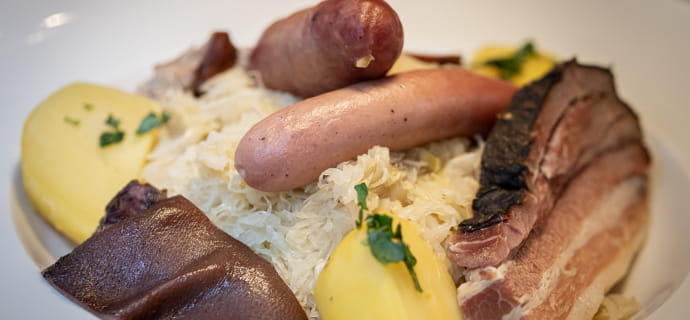 Ontdek de subtiliteiten van de Elzasser gastronomie in een traditioneel kader, versierd met gordijnen en geruite tafelkleden die typisch zijn voor de Elzas. De kelder is ideaal voor een gezellige avond met vrienden en in de zomer biedt het terras een schilderachtig uitzicht over de daken van de stad. U kunt dus genieten van een gastronomische pauze in het historische hart van Straatsburg!
