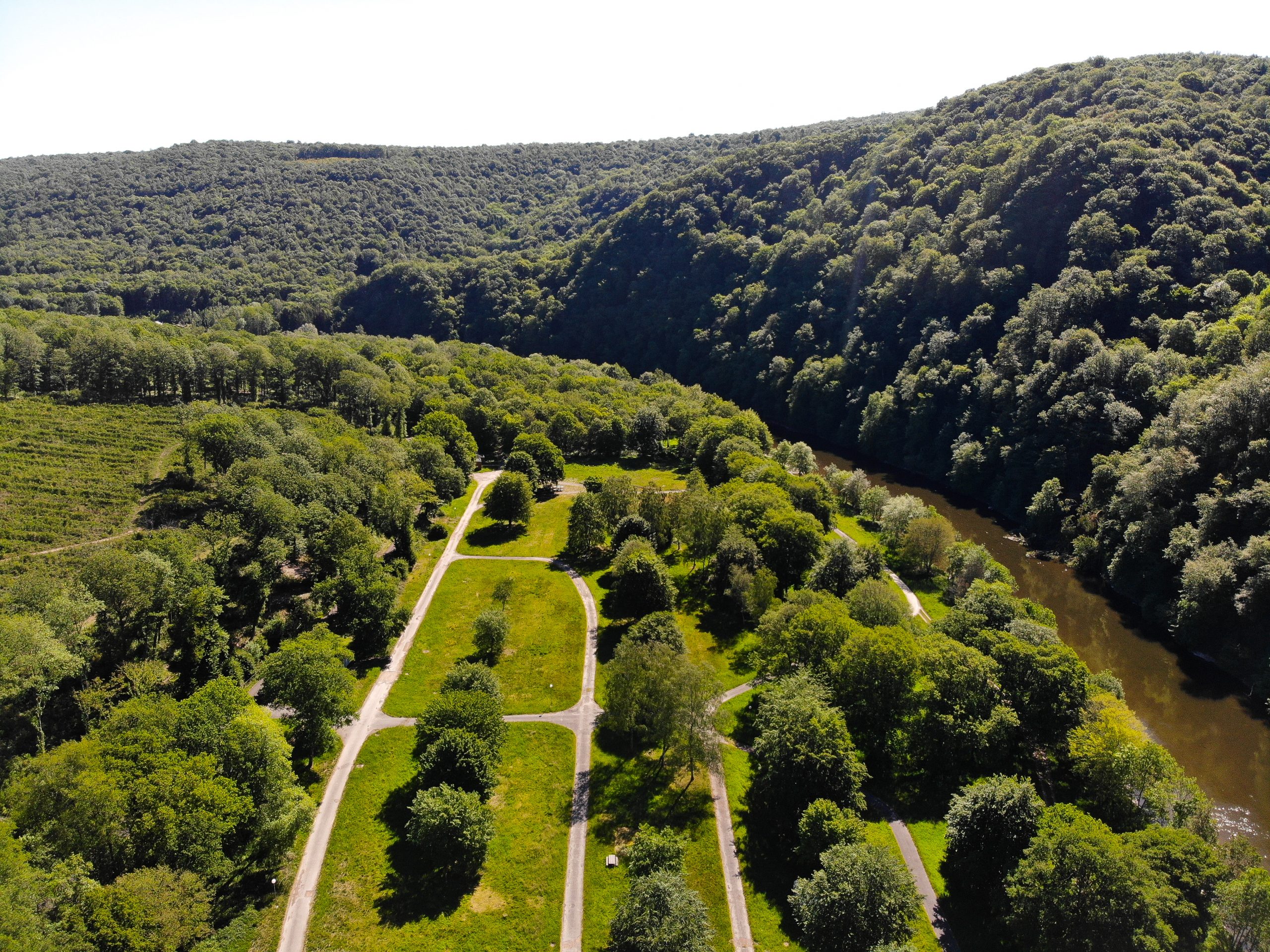 Uitzicht op de meanderende Maas vanaf het voorplein van de Basilique Sainte-Jeanne-d'Arc