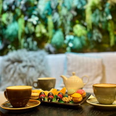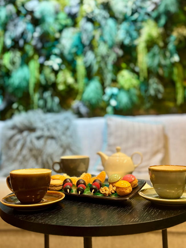 - Une gourmandise servie dans notre lounge ou sur l'une de nos terrasses extérieures, ainsi qu'une boisson chaude ou un soft