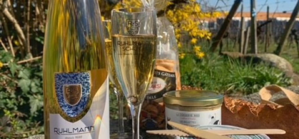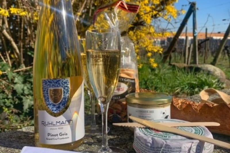 Grâce au plan fourni, explorez les sentiers qui traversent les vignes et laissez-vous guider jusqu’à une charmante maisonnette nichée au cœur du Grand Cru. C’est ici que vous profiterez d’une pause gourmande bien méritée : un verre de vin accompagné de produits locaux soigneusement sélectionnés. Dans votre sac, tout est prévu pour un moment convivial : une bouteille de Grand Cru, verres, pain frais, terrine alsacienne, fromage fermier, bretzels, bredeles et même un tire-bouchon aux couleurs de la maison Ruhlmann.
