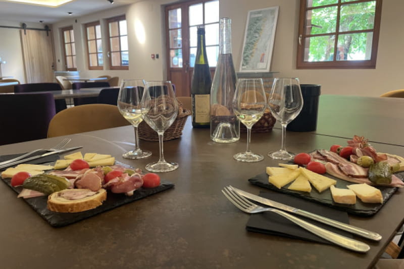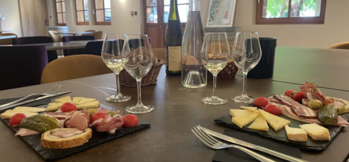 Après la visite, place à la dégustation ! Autour d’une planchette généreuse composée de fromages affinés et de charcuteries locales, vous goûterez cinq cuvées soigneusement sélectionnées. Chaque vin est associé à un mets pour en sublimer les arômes, dans un accord simple et raffiné. Une alternative savoureuse au restaurant, idéale pour une pause gourmande, dans un cadre chaleureux.