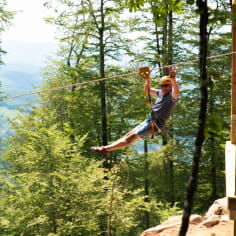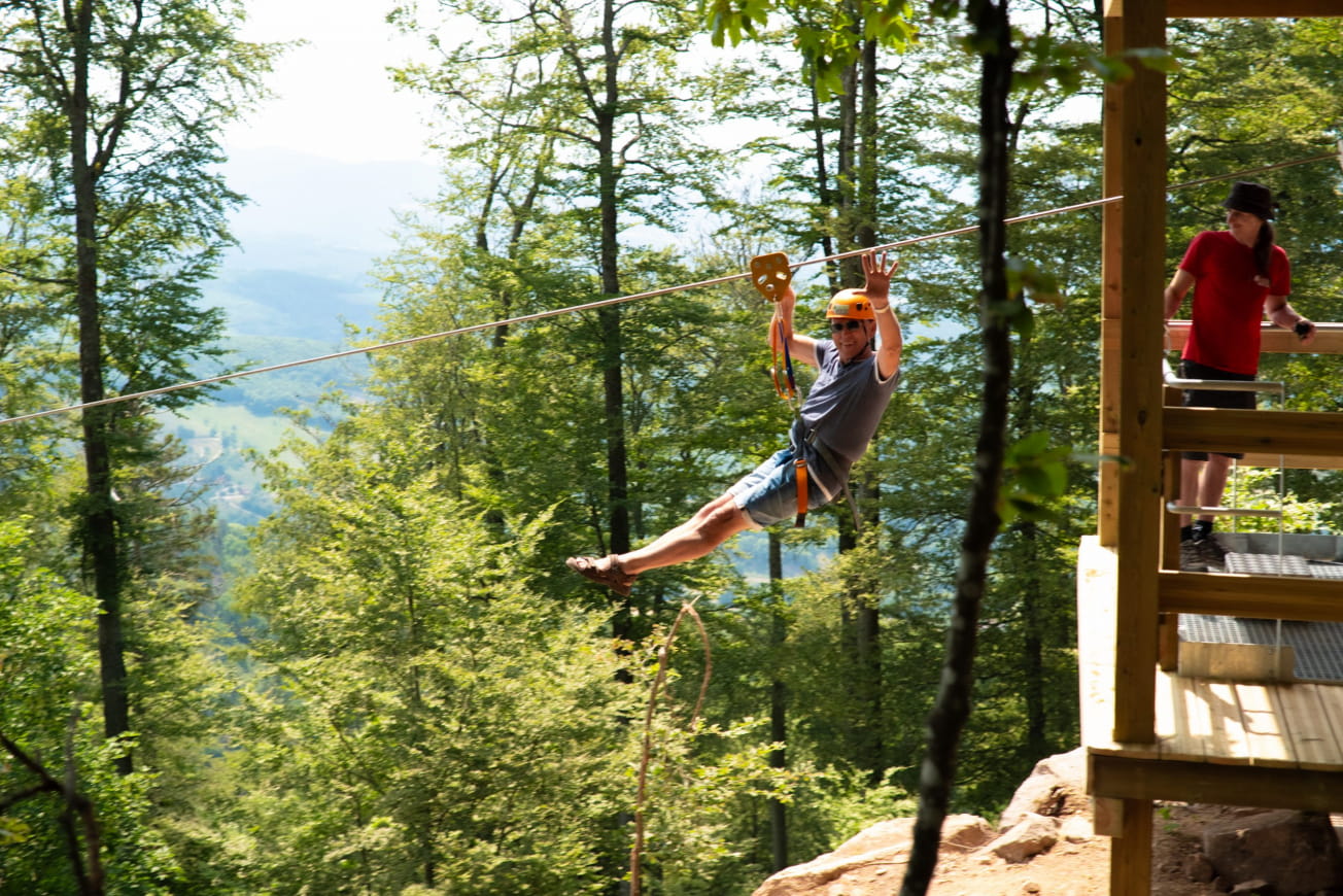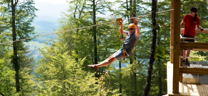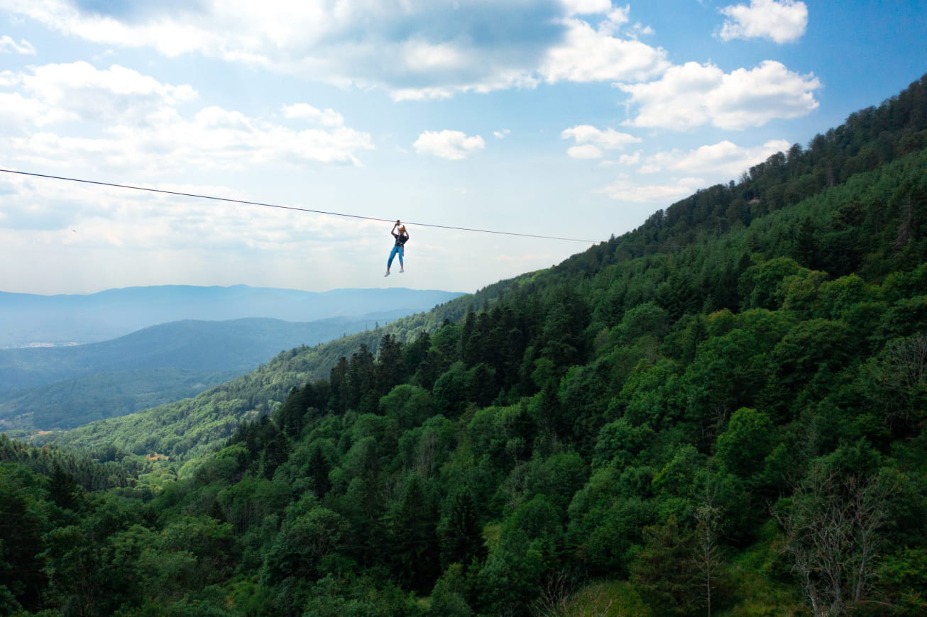 À 50 mètres au-dessus du sol, lancez-vous pour une session de vol en pleine nature. Avec ses 900 mètres de longueur et une vitesse de pointe pouvant atteindre 90 km/h, cette tyrolienne est l’une des plus impressionnantes d’Alsace. Le panorama à couper le souffle sur la vallée et les massifs alentours ajoute une dimension unique à cette expérience.