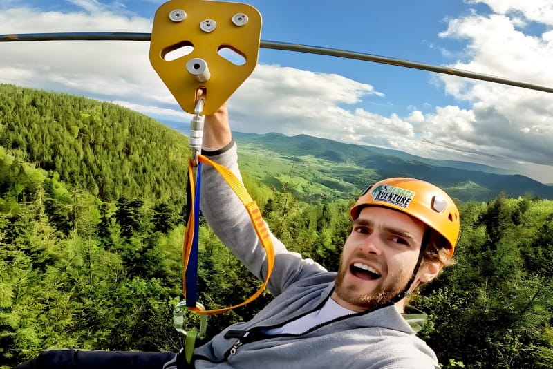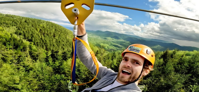 Prenez de l’altitude et vivez un moment riche en émotions avec la maxi tyrolienne du Parc Alsace Aventure à Breitenbach. Accessible en navette jusqu’au point de départ, cette activité vous promet une descente inoubliable, entre ciel et forêt vosgienne.