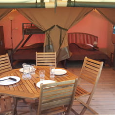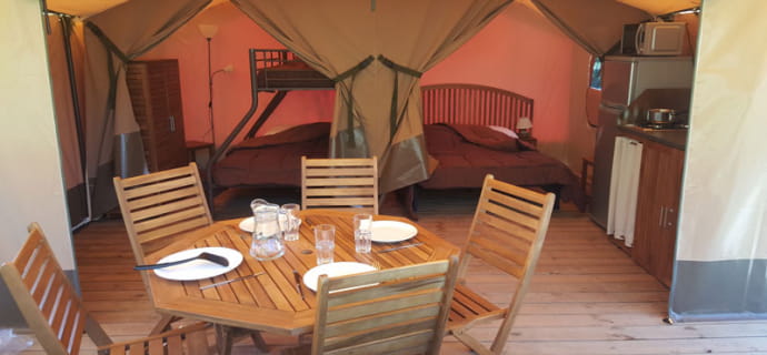 Ces hébergements authentiques, toilés de charme, ont une capacité de 4 à 5 personnes avec une superficie de 20 à 30 m2. Chaque lodge dispose d’une terrasse couverte : le privilège de manger à l’extérieur au milieu d’une nature verdoyante !