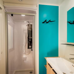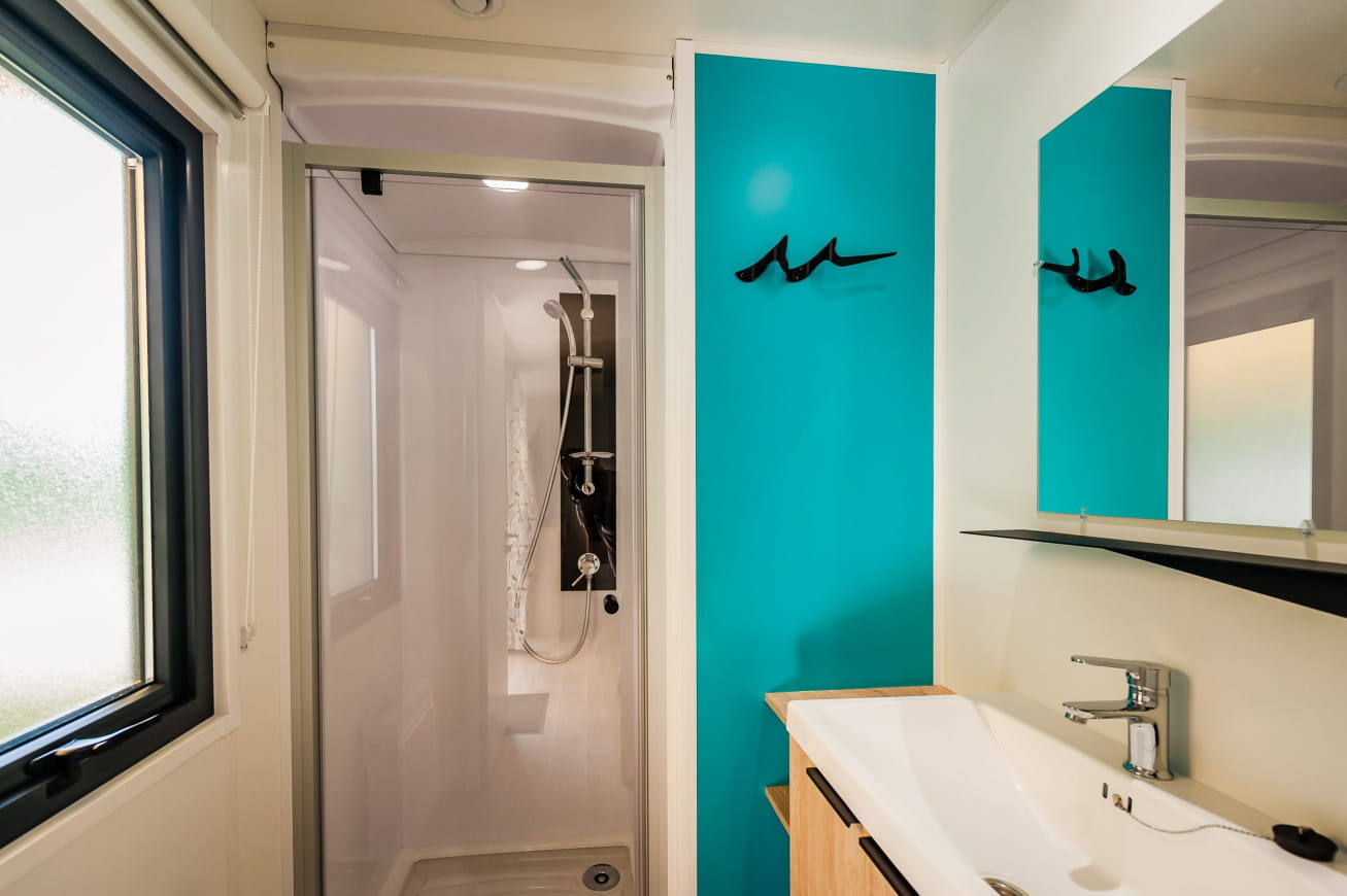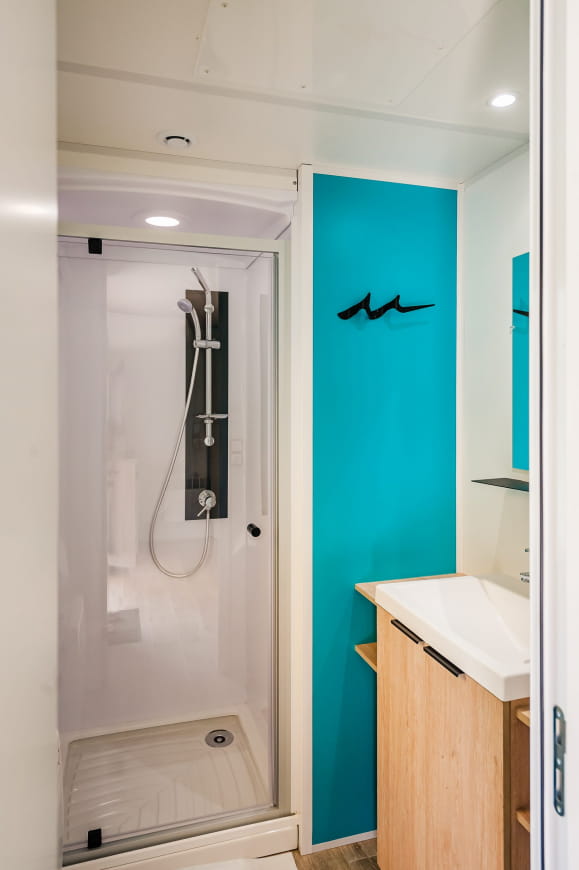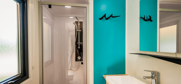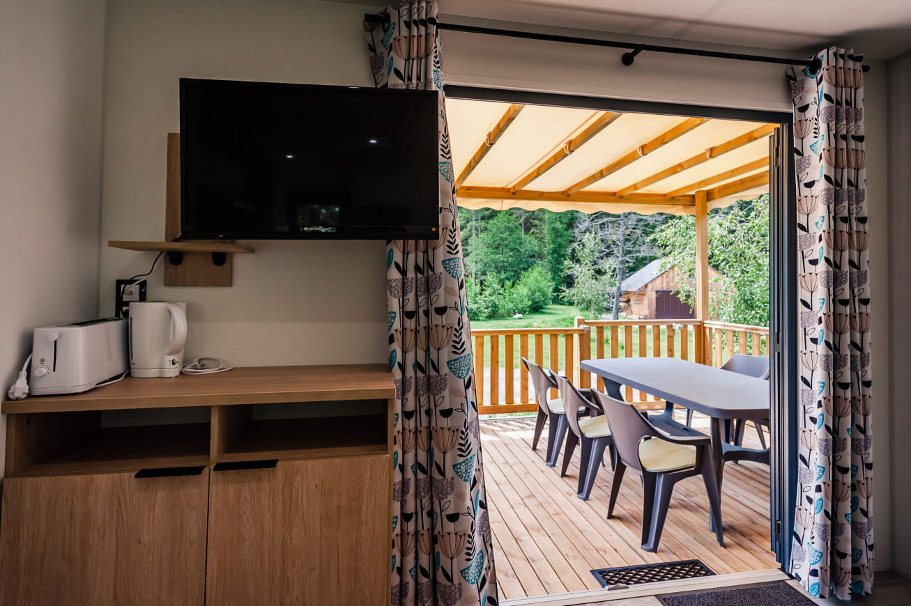 Pour vos moments de détente, le mobil-home vous accueille dans différents espaces selon vos envies. Retrouvez-vous dans l’espace salon avec télévision, prélassez-vous dans le salon de jardin entouré par la nature, ou appréciez le paysage depuis la terrasse couverte ! La tranquillité des lieux ne manquera pas de vous faire évader !