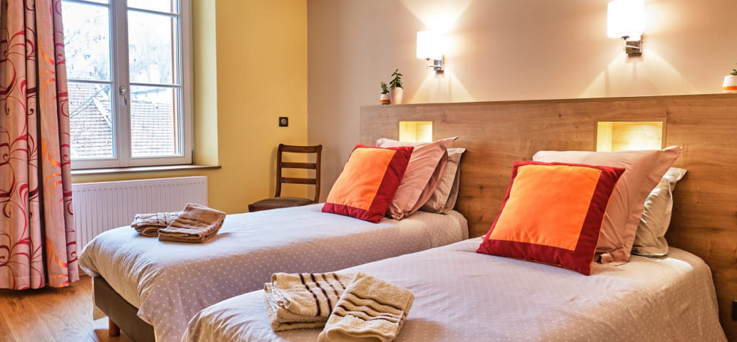 Réveillez-vous avec la lumière du soleil levant dans la chambre Prana qui a deux lits simples et bénéficie d’une vue sur le jardin ainsi que sur le canal des usines et la préfecture.