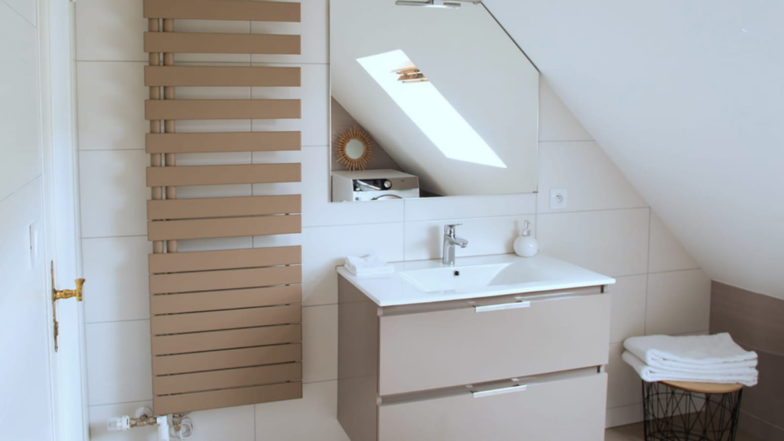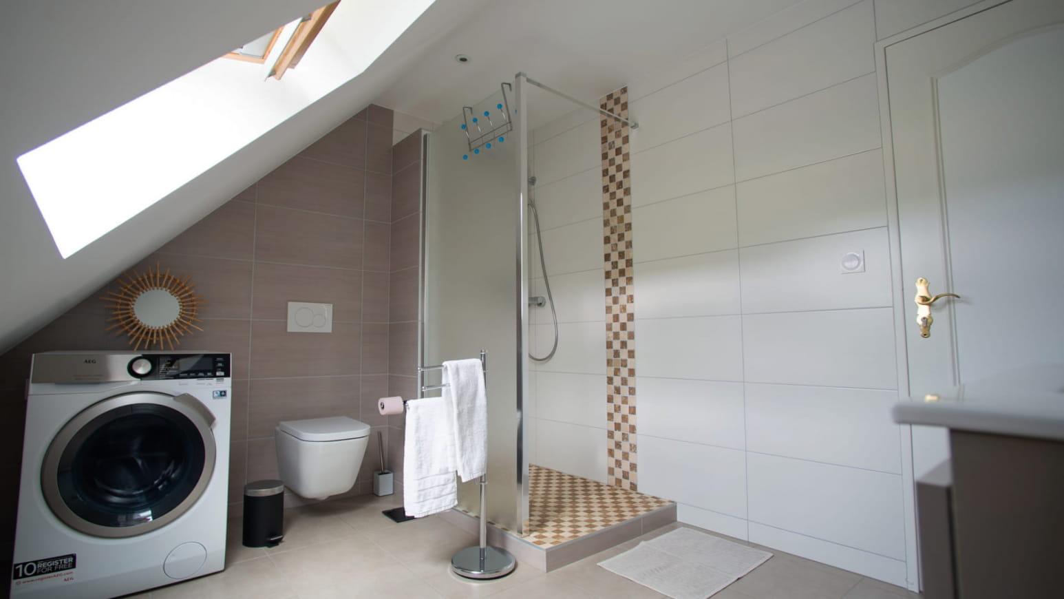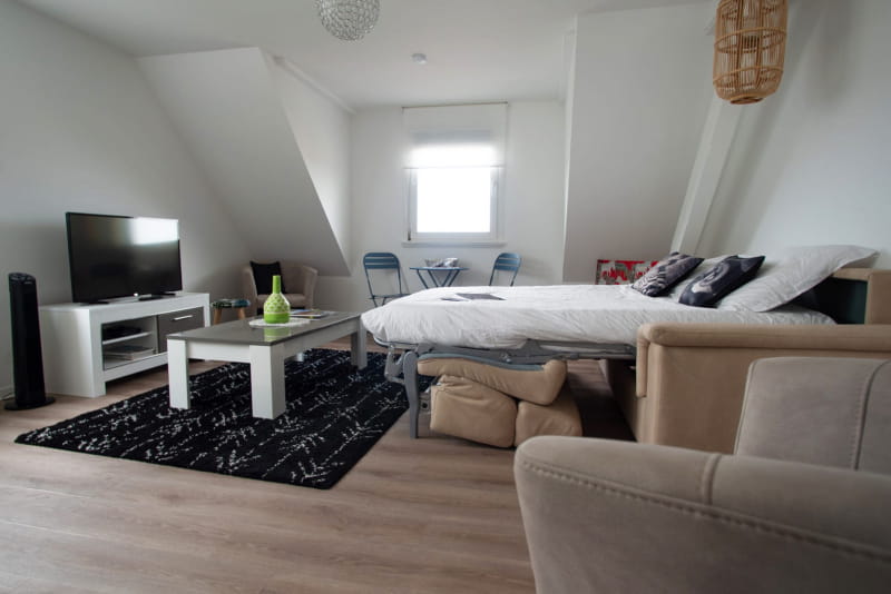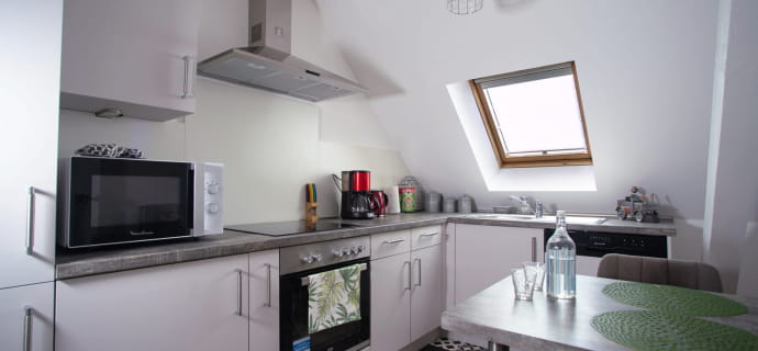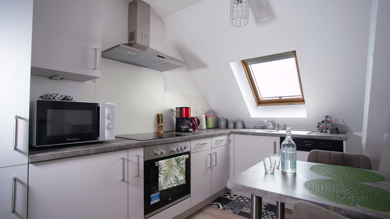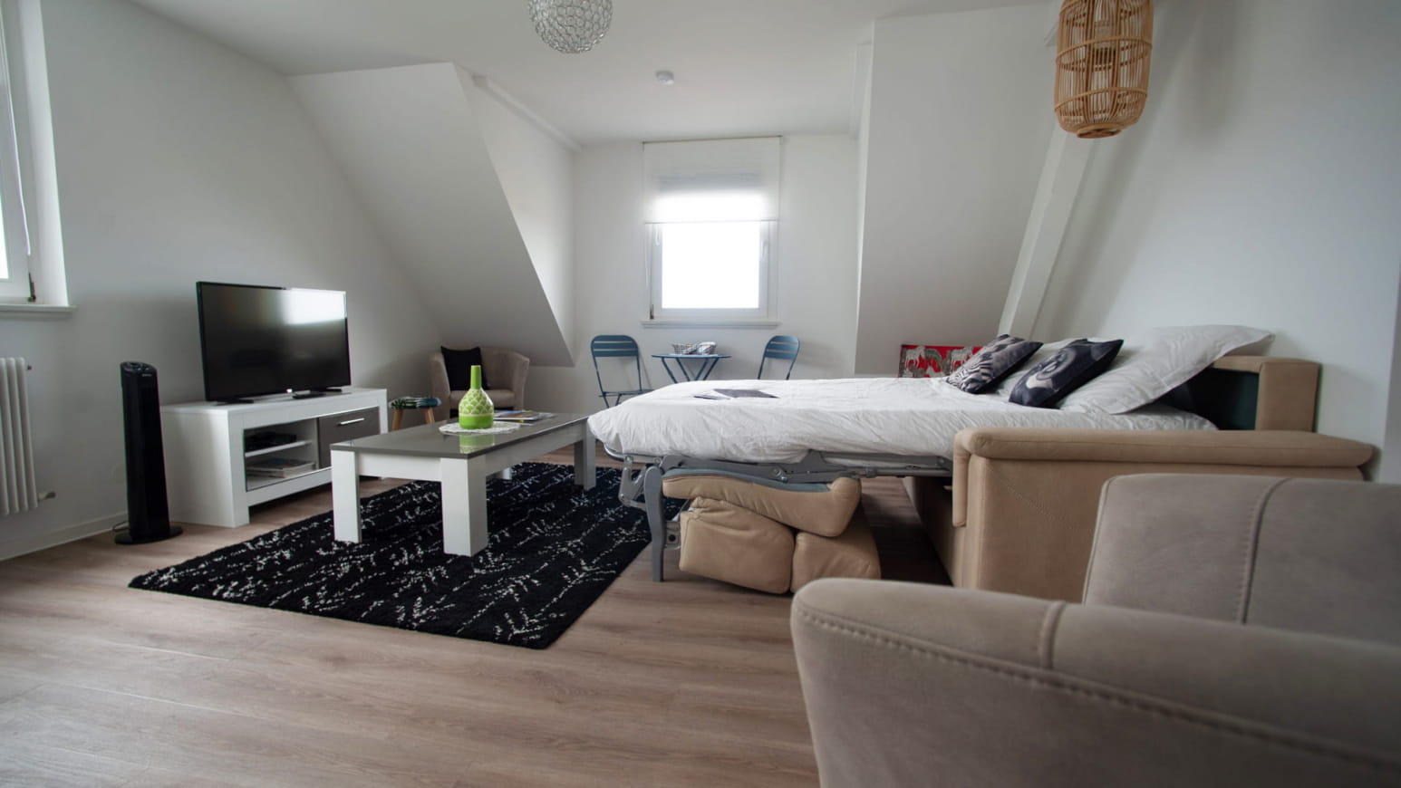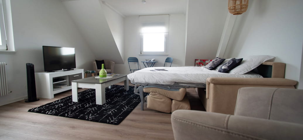 Installé au 2ᵉ étage d’une maison alsacienne, cet appartement tout confort se compose d’une grande pièce à vivre lumineuse avec un canapé-lit haut de gamme, d’une cuisine indépendante entièrement équipée, et d’une salle d’eau moderne avec douche à l’italienne. Entièrement neuf et décoré avec soin, il offre un environnement calme et chaleureux, idéal pour se ressourcer en couple.