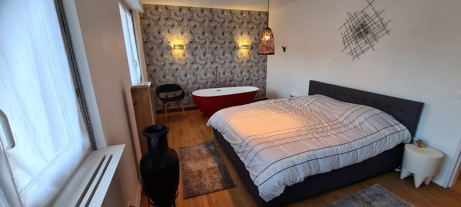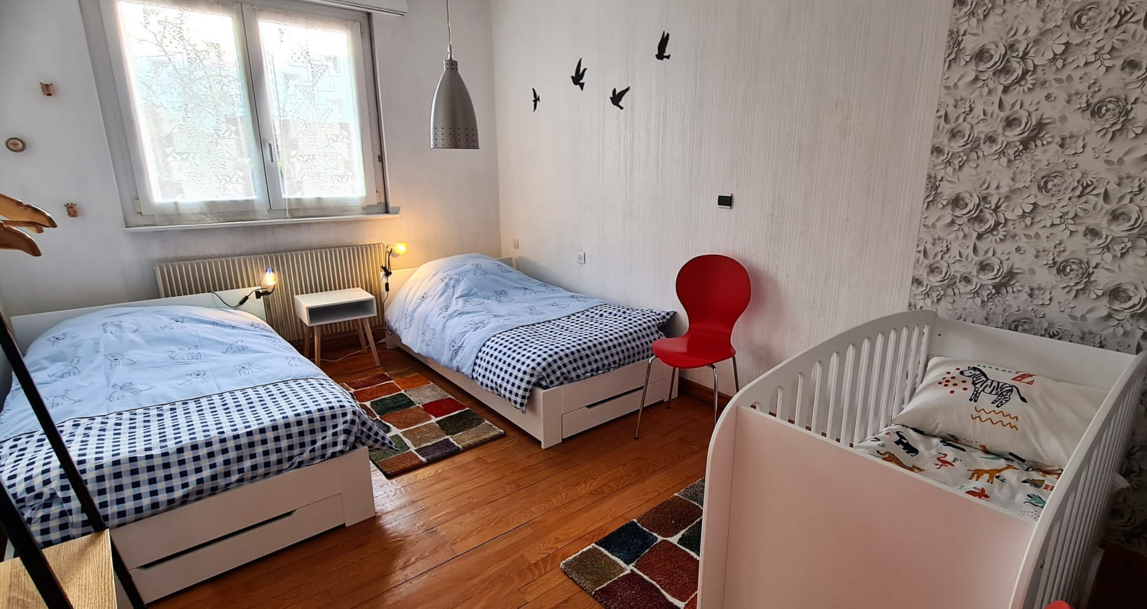Situé au premier étage de la maison des propriétaires, le gîte Au pied du Strang bénéficie d’une atmosphère tranquille, au calme, avec une entrée privative et un emplacement sécurisé pour une voiture. D’une superficie de 100m², il dispose de 3 chambres confortables, respectivement équipées de 1 lit double et une baignoire, un autre lit double, ainsi que 2 lits individuels et 1 lit bébé. Vous y trouverez l’ensemble des commodités pour un séjour confortable, dont une literie de qualité et une connexion Wifi haut débit.